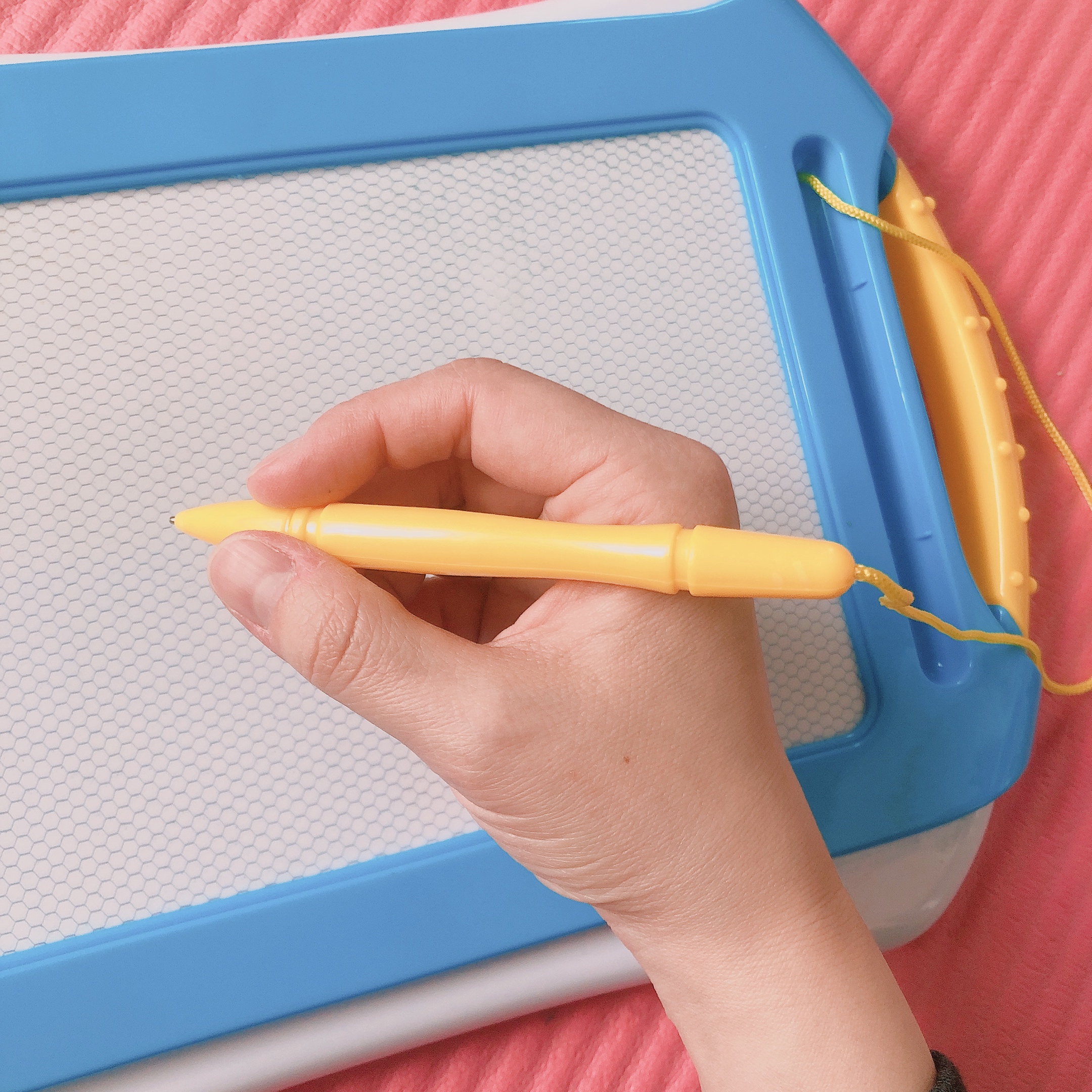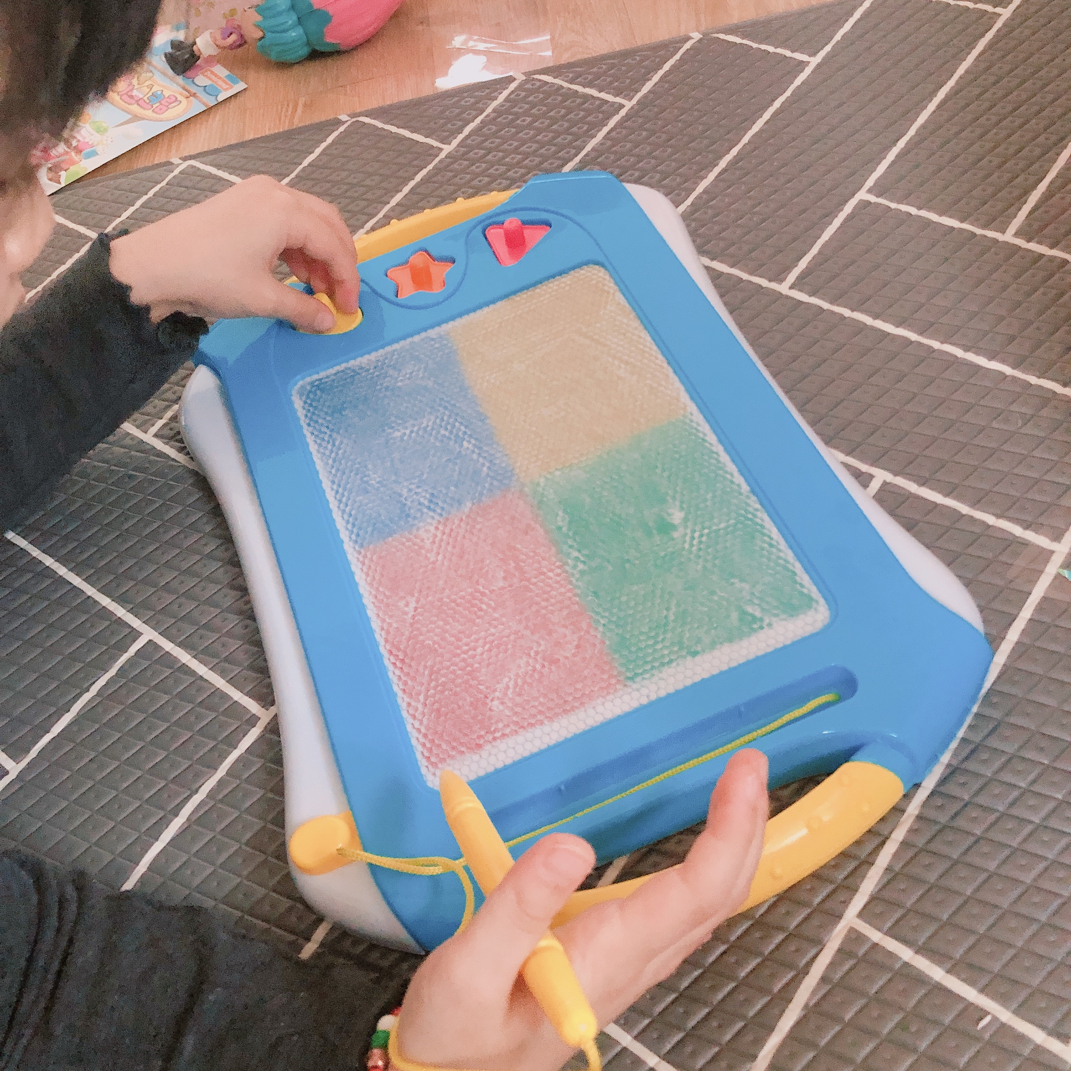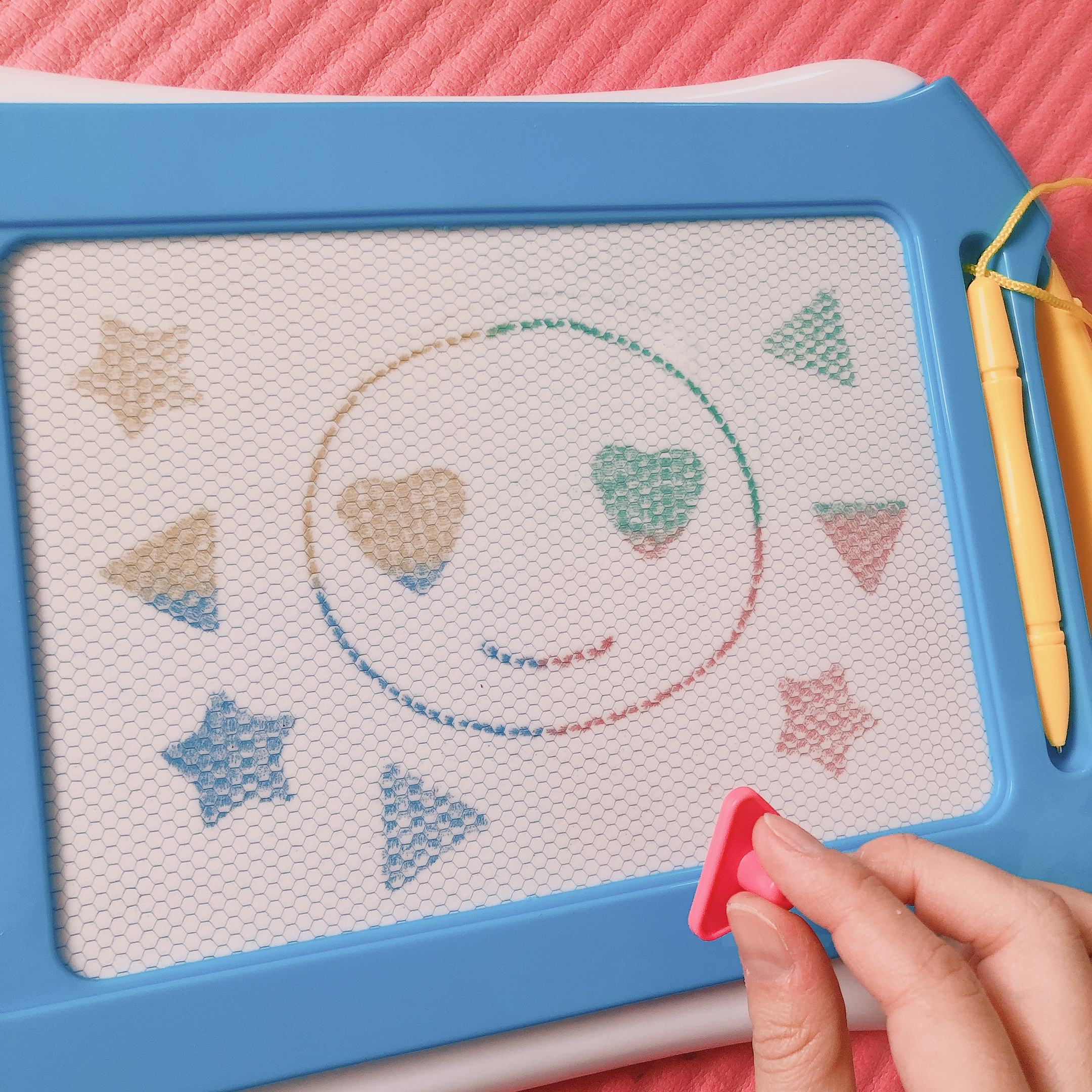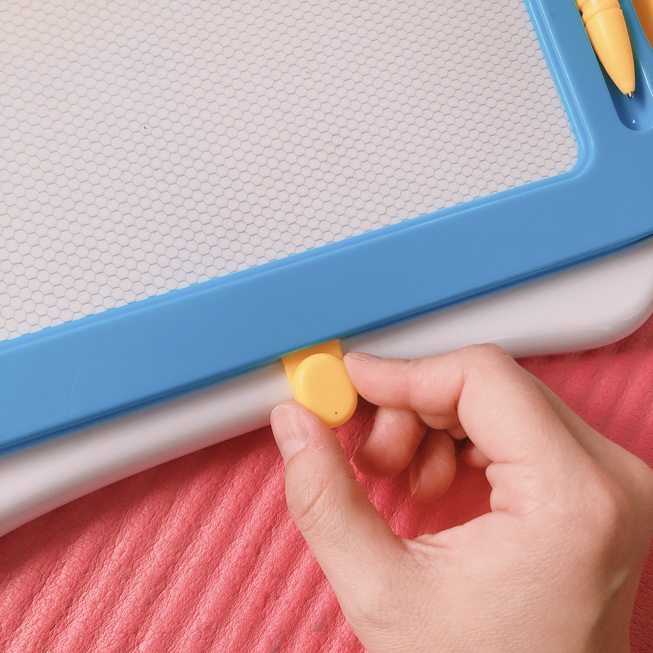 포장을 뜯어 보았는데 페인팅 공간이 다른 칼라보드나 자석칠판보다 훨씬 넓어서 시원한 느낌을 주었다. 양쪽에 손잡이가 있어서 가지고 다니기에도 편리할 것 같다. 왼쪽에는 자석 스탬프 3개가 꽂혀있고, 오른쪽에는 자석펜이 실로 연결되어 있어 분실 위험이 없다. 아랫부분에 있는 슬라이드 바의 손잡이는 막대형 지우개이다. 손으로 잡고 좌우로 이동시키면 아직까지 그린 그림이 모두 사라진다.