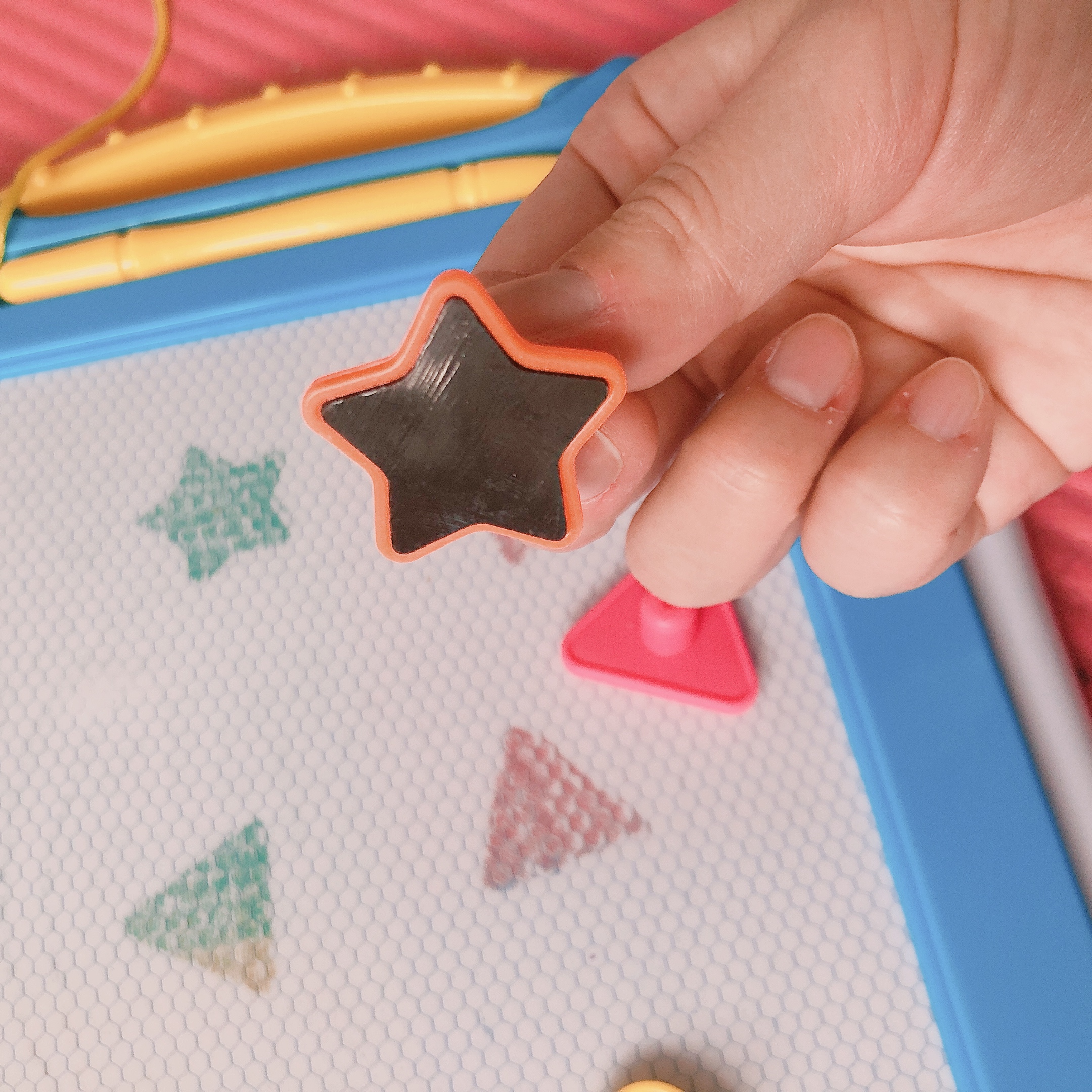 4가지 색깔과 스탬프 모양을 확인한 후에 바로 응용해서 그림을 그리는 하요미~ 세모 스탬프를 이용해서 집의 지붕과 아랫부분에 바다를 완성했다. (파도인 듯?) 하늘에는 별모양 스탬프도 찍고, 한참을 재미있게 그림을 그리고 놀았다. 계속 지우며 새로운 그림을 그릴 수 있는 것이 장점인 칼라보드 자석칠판인데... 작품을 완성했다며 지우지 못하게 하는 게 함정...ㅋㅋㅋ