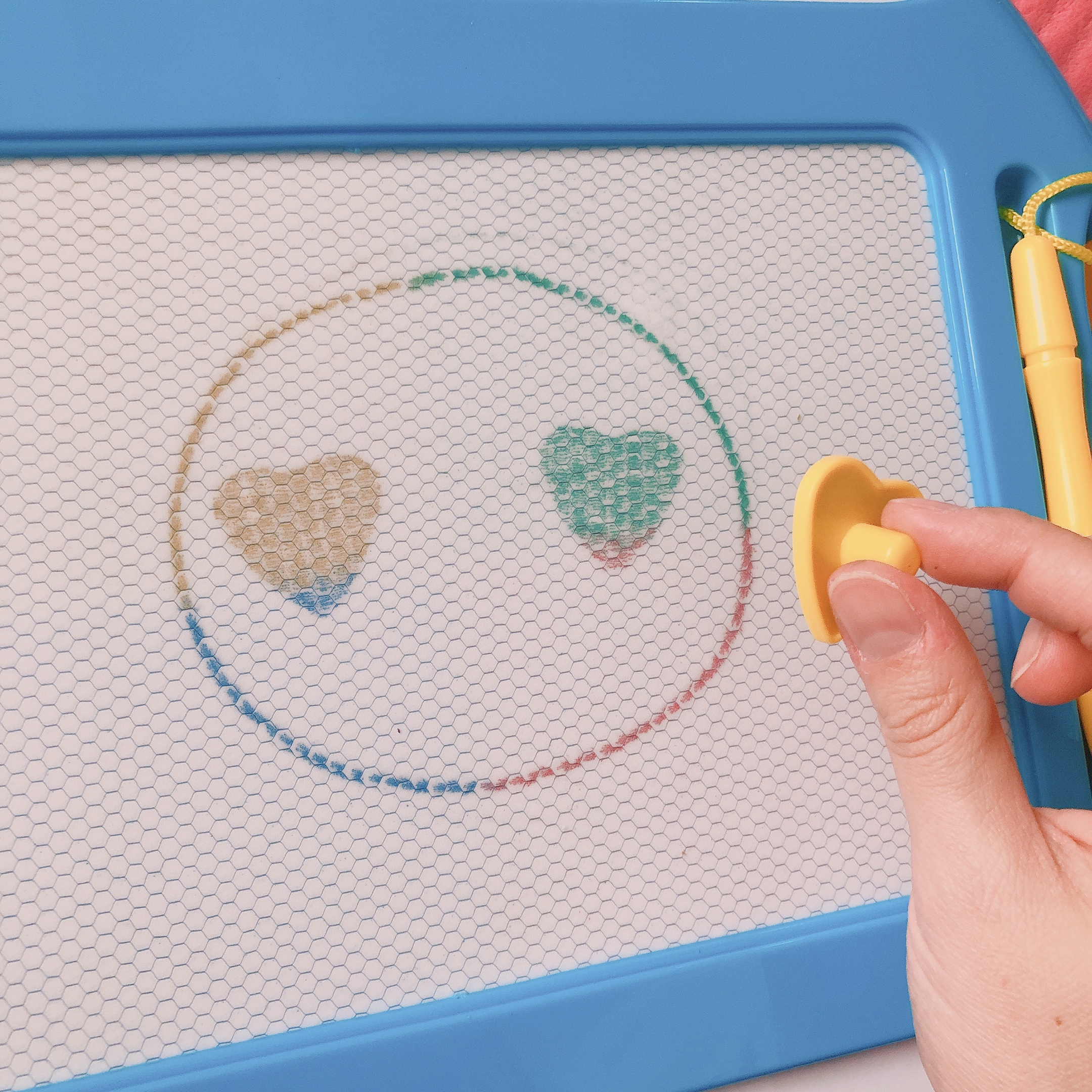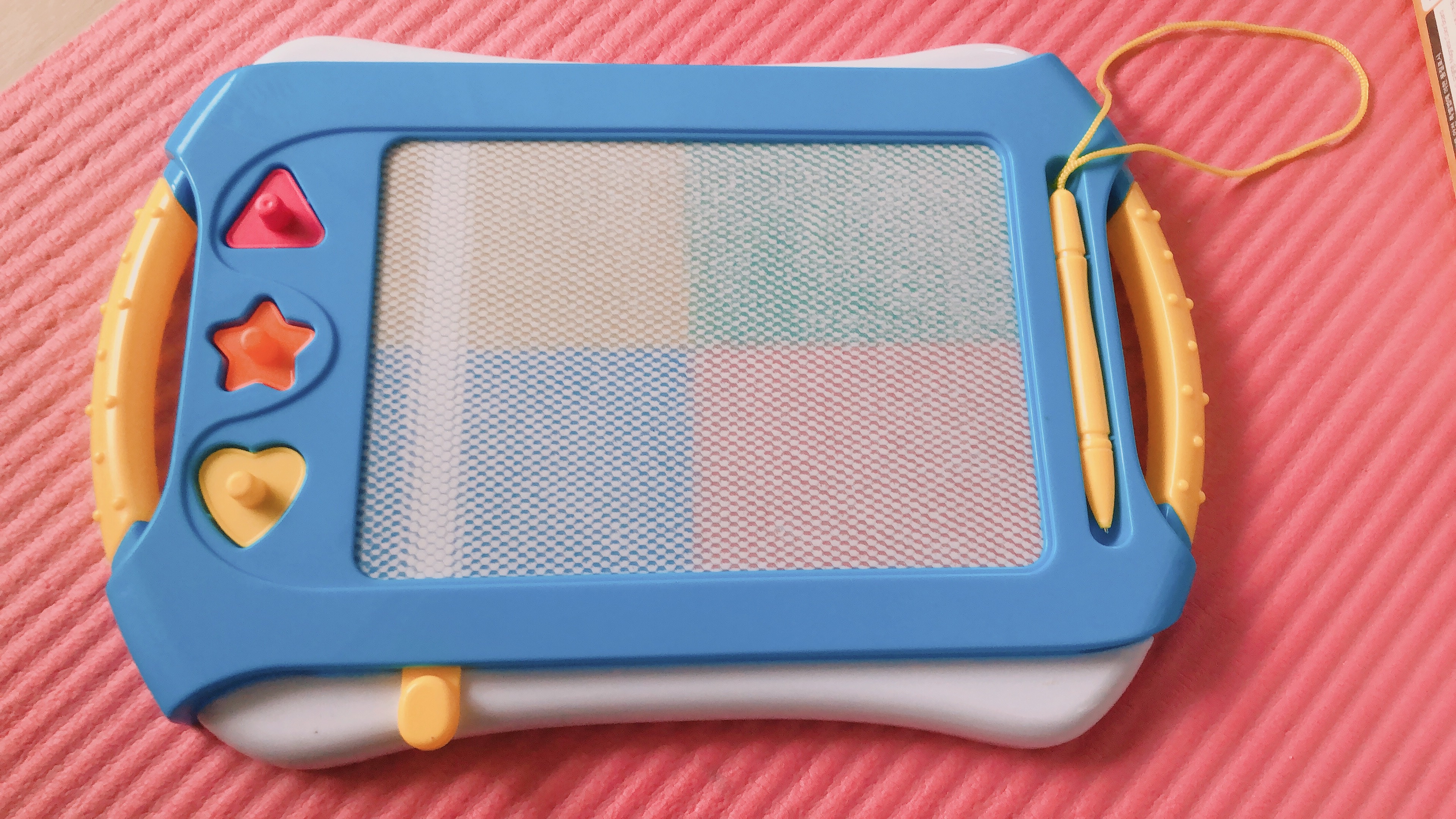 포장을 뜯어 보았는데 페인팅 공간이 다른 칼라보드나 자석칠판보다 훨씬 넓어서 시원한 느낌을 주었다. 양쪽에 손잡이가 있어서 가지고 다니기에도 편리할 것 같다. 왼쪽에는 자석 스탬프 3개가 꽂혀있고, 오른쪽에는 자석펜이 실로 연결되어 있어 분실 위험이 없다. 아랫부분에 있는 슬라이드 바의 손잡이는 막대형 지우개이다. 손으로 잡고 좌우로 이동시키면 아직까지 그린 그림이 모두 사라진다.