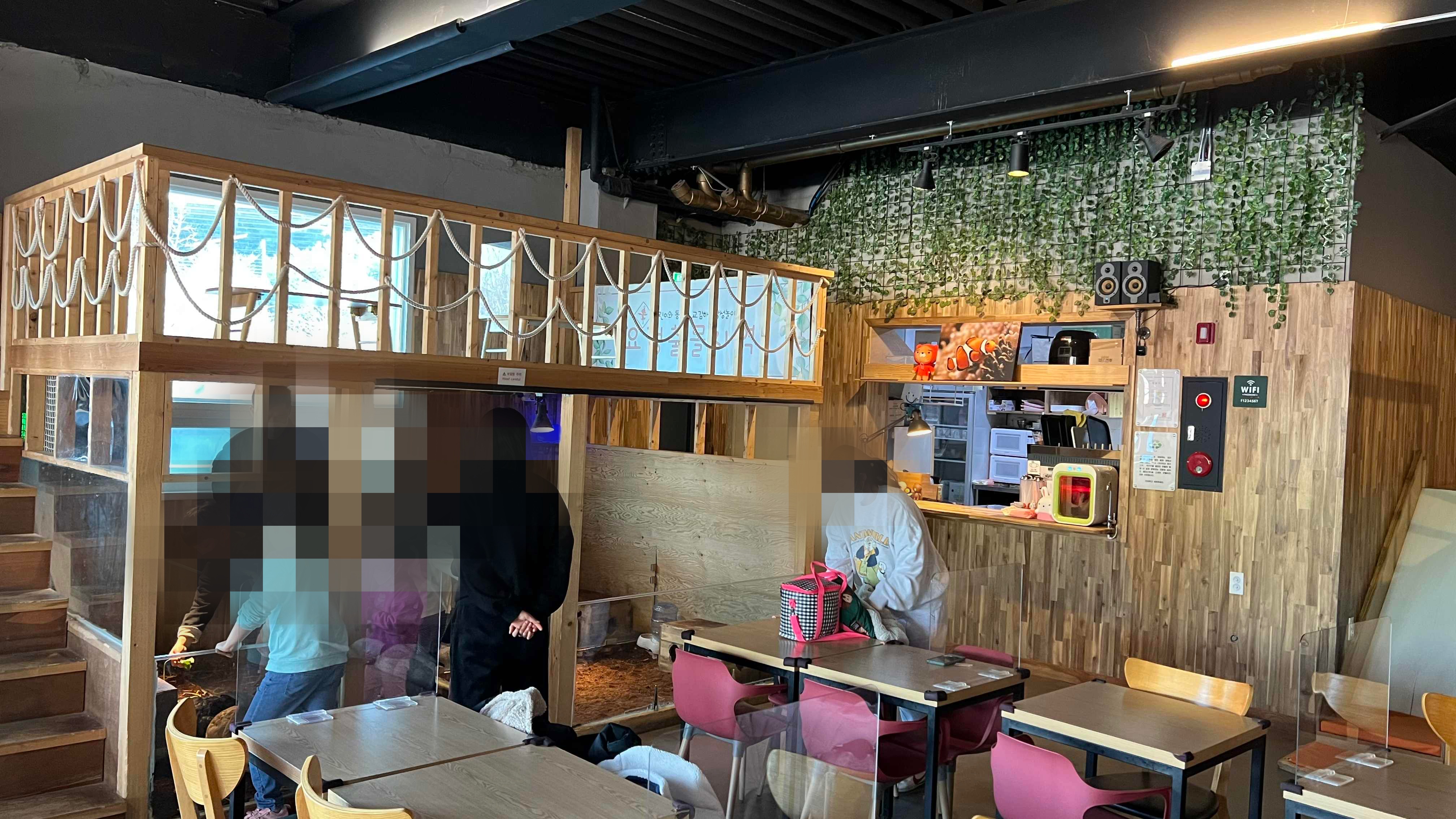 아이들이 놀 수 있는 작은 미끄럼틀과 그 아래에는 야광놀이터존이 마련되어 있다. 야광놀이터는 나도 처음보는 거였는데 손전등을 켜서 벽면에 대고 그림을 그리면 야광그림을 그려 볼 수 있는 곳이었다. 정말 신기했다. 멀리 가지 않아도 카페 안에 화장실, 손 씻을 수 있는 세면대가 있어서 편리했던 것 같다.