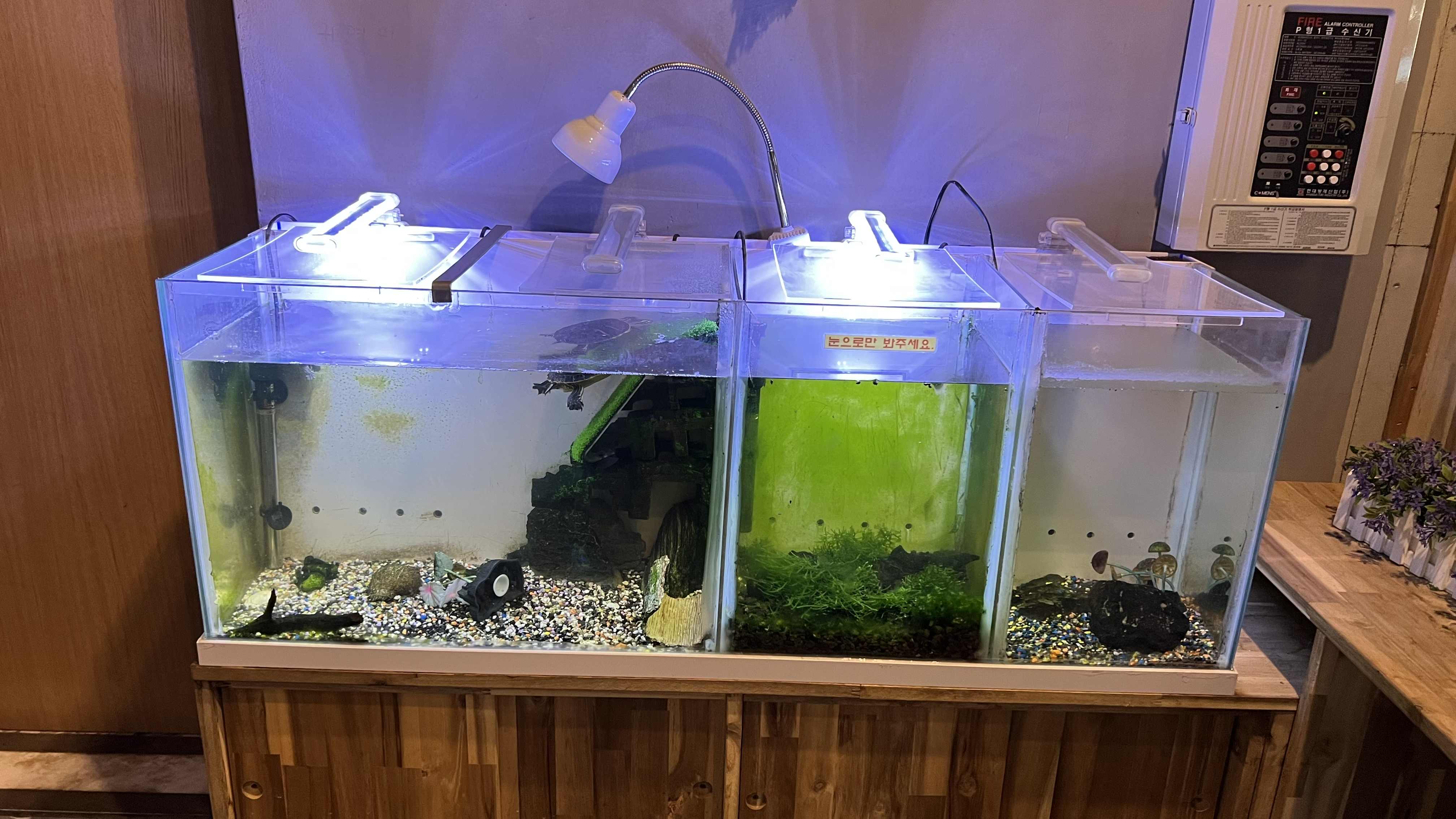 카페를 한바퀴 둘러보았다. 작은 금붕어 두마리가 살고 있는 어항? 수족관?과 그 옆에는 닥터피쉬 체험존이 있었다. 손을 넣으면 닥터피쉬들이 몰려든다고 하는데 물고기들이 내 손에는 관심을 갖지 않았다. (왜지-_-) 반대쪽 수족관에선 거북이, 작은 새우 등이 살고 있었다.