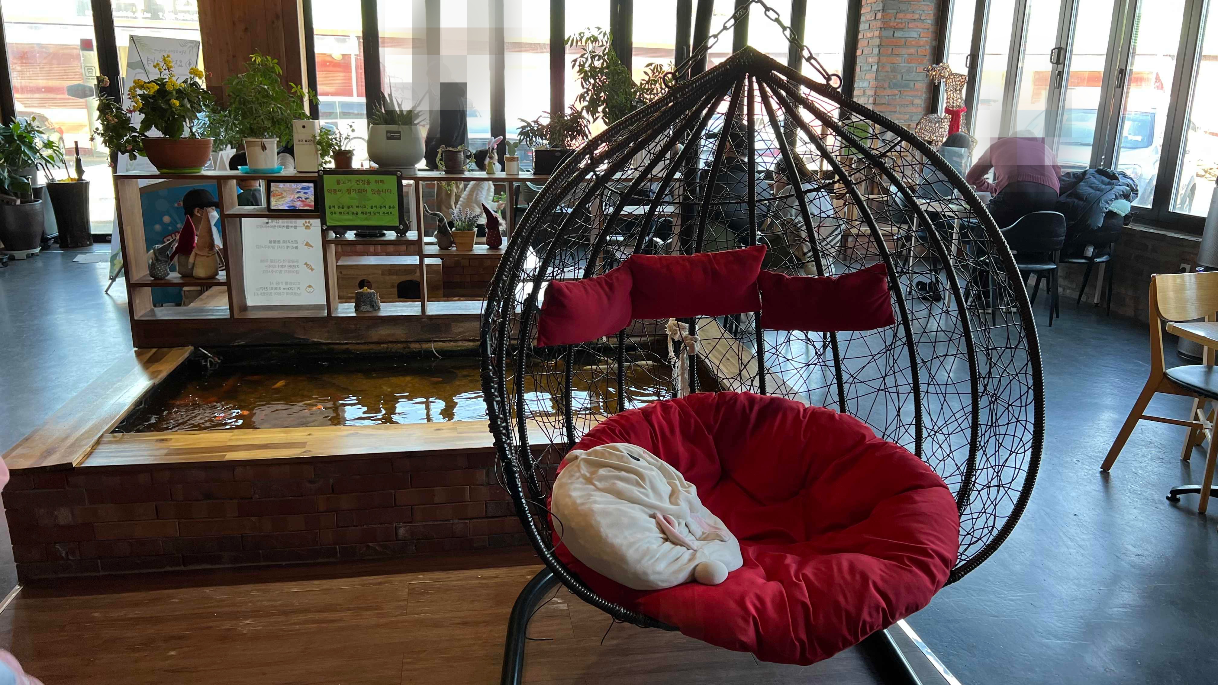 카페를 한바퀴 둘러보았다. 작은 금붕어 두마리가 살고 있는 어항? 수족관?과 그 옆에는 닥터피쉬 체험존이 있었다. 손을 넣으면 닥터피쉬들이 몰려든다고 하는데 물고기들이 내 손에는 관심을 갖지 않았다. (왜지-_-) 반대쪽 수족관에선 거북이, 작은 새우 등이 살고 있었다.