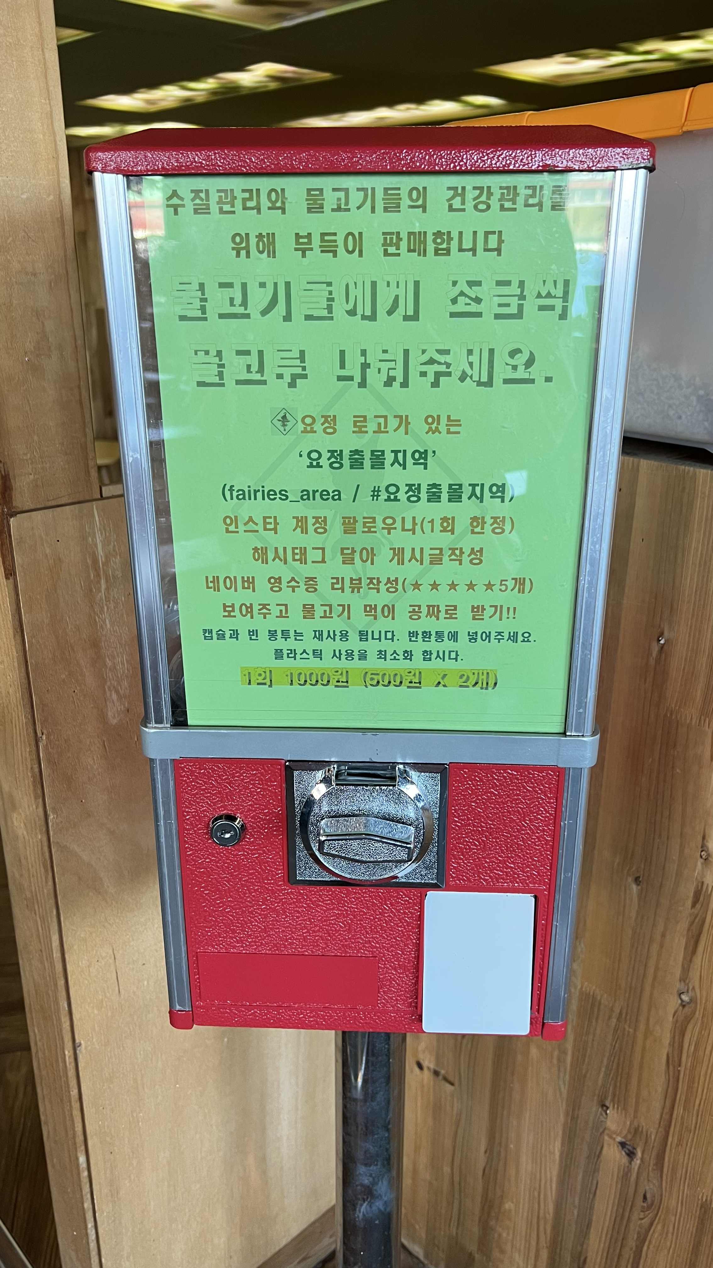 물고기 먹이는 유료로 구매하거나(1개 1,000원) 인스타 계정 팔로우, 해시태그 달아 게시글 작성, 네이버 영수증 리뷰작성 중 1개 이벤트를 참여하면 무료로 받을 수 있다. 나는 인스타그램에 해시태그 게시글을 작성해서 1개를 받고, 계속 하고 싶어하는 아이들을 위해 2개는 유료로 구매했다.