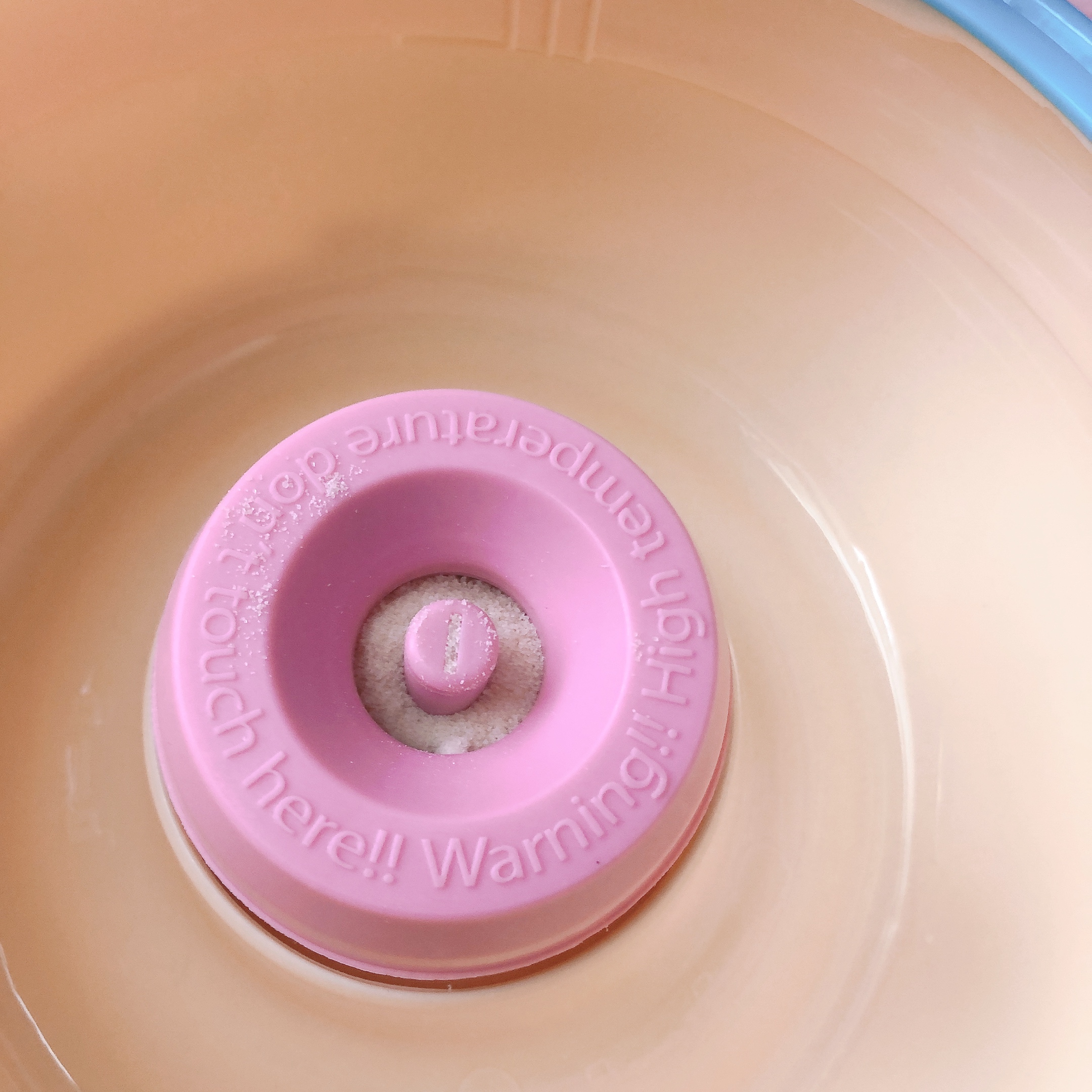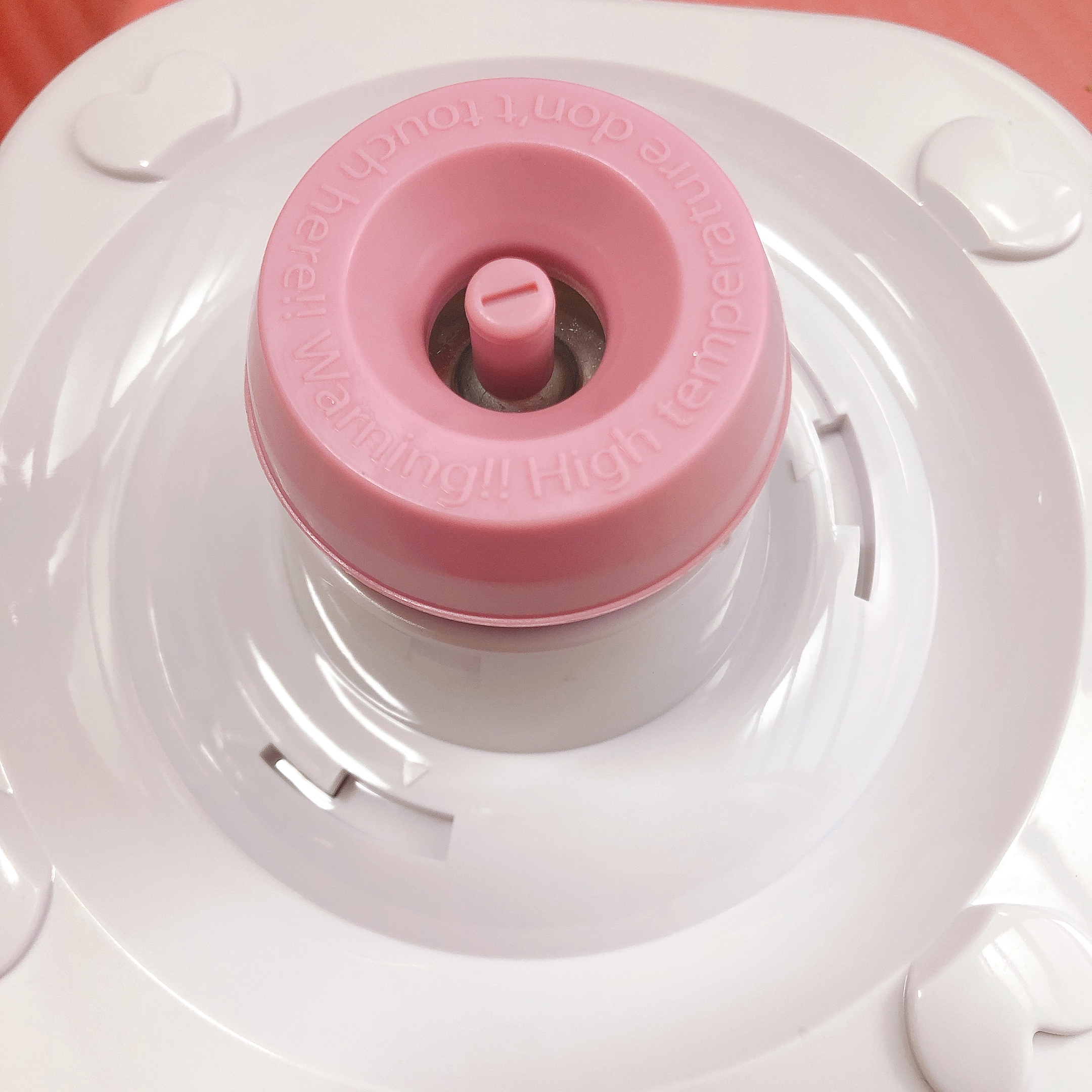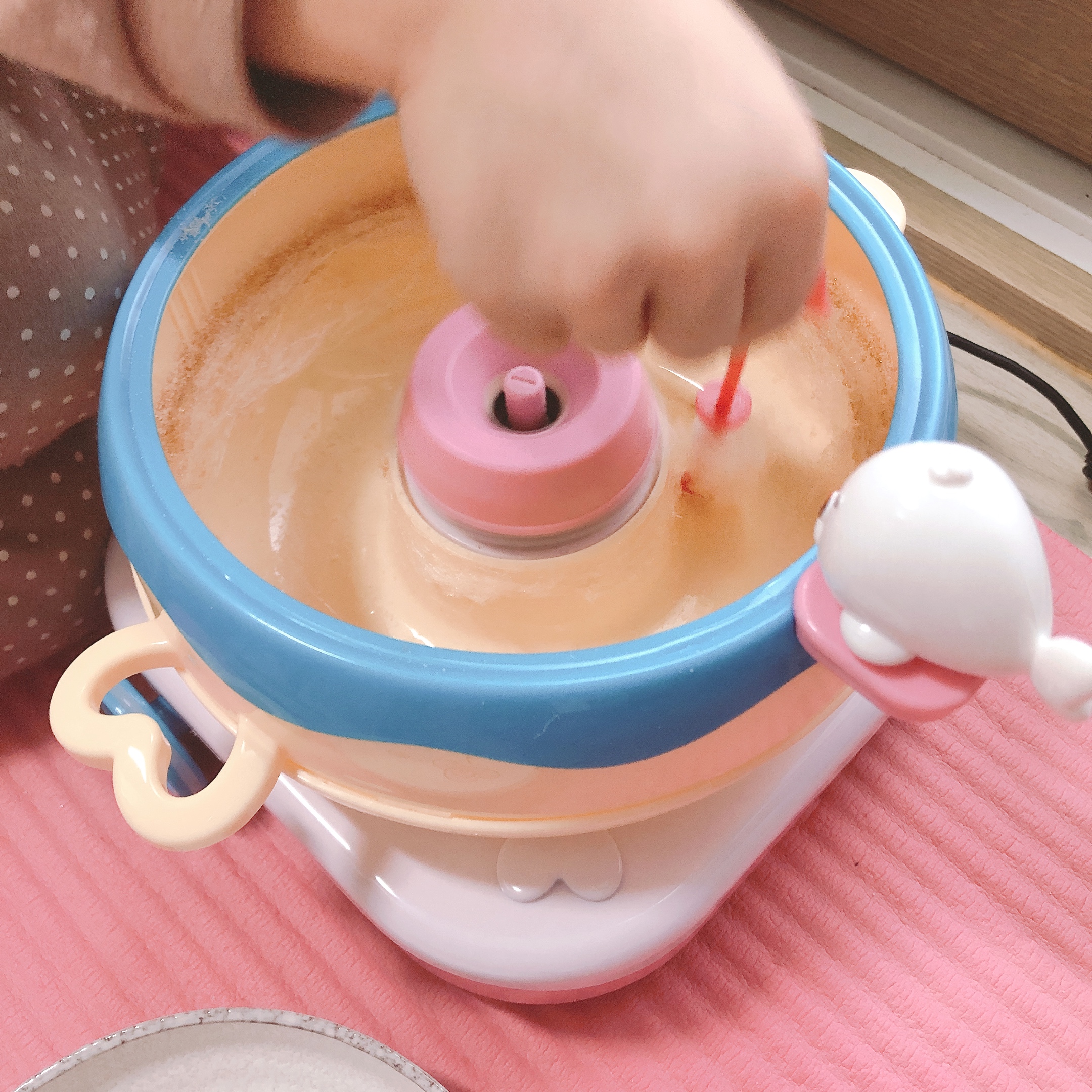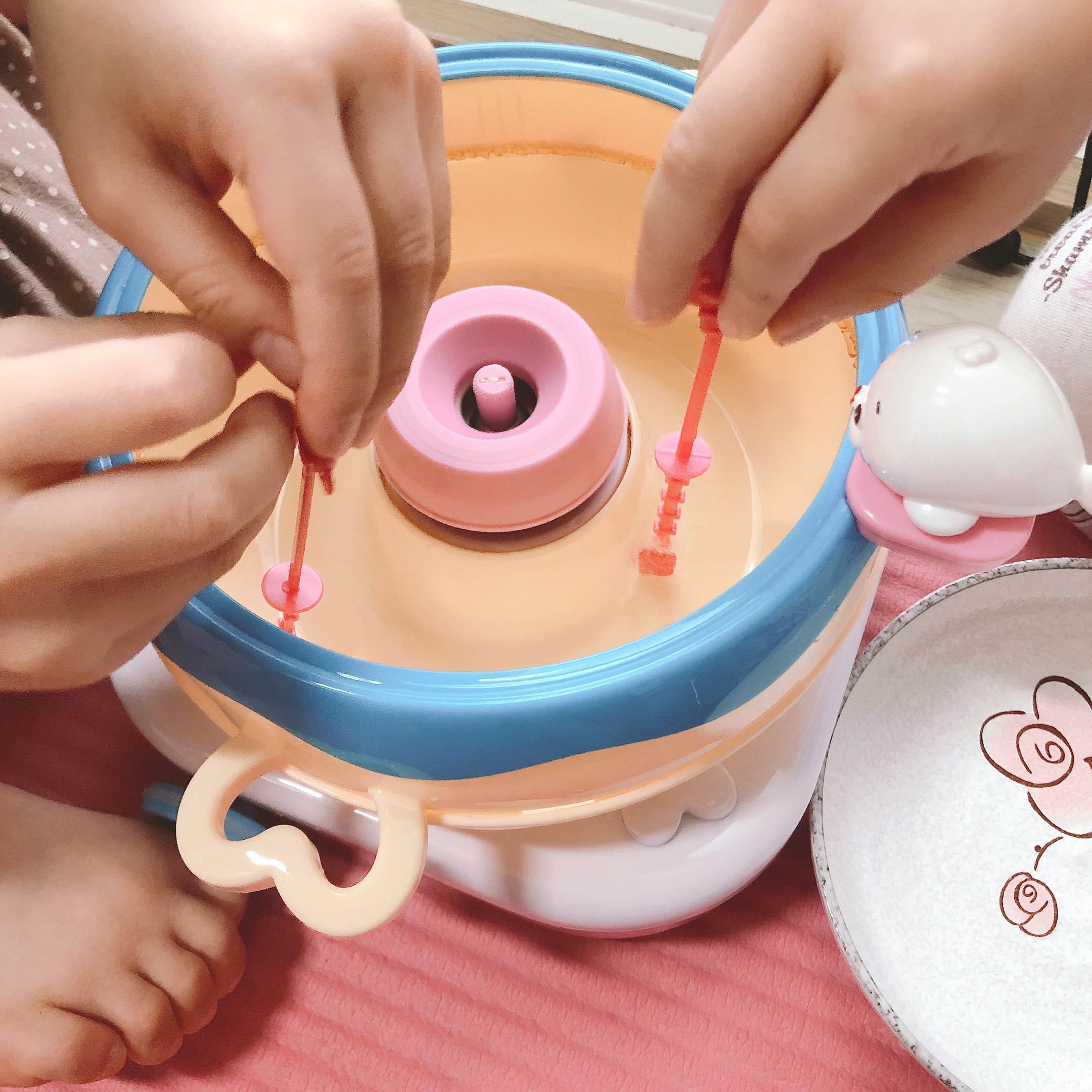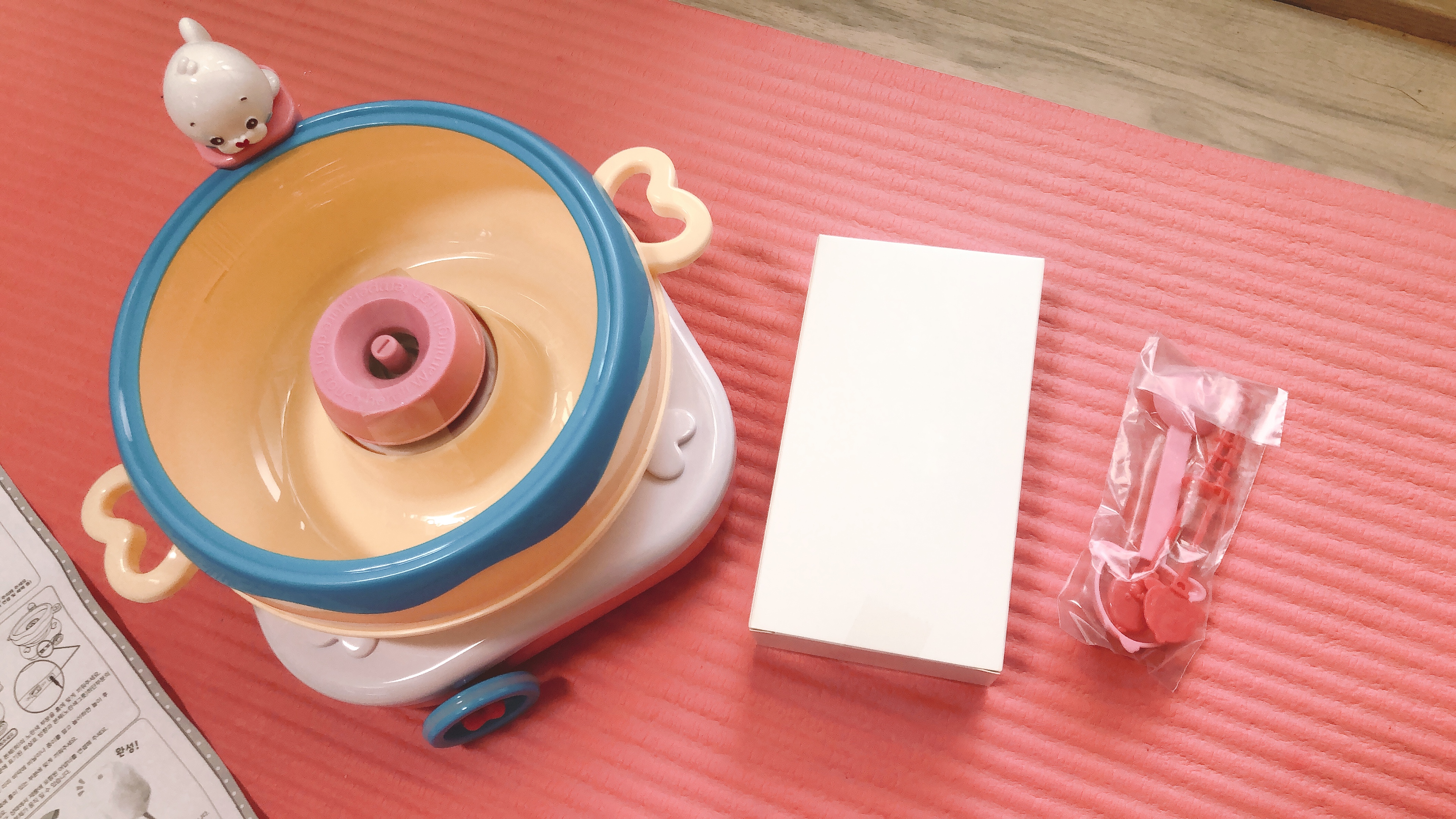 - 솜사탕이 나오기 시작하면 막대로 빙글빙글 돌린다. (분홍캡 부분이 뜨거울 수 있으니 손이 닿지 않도록 주의!)
