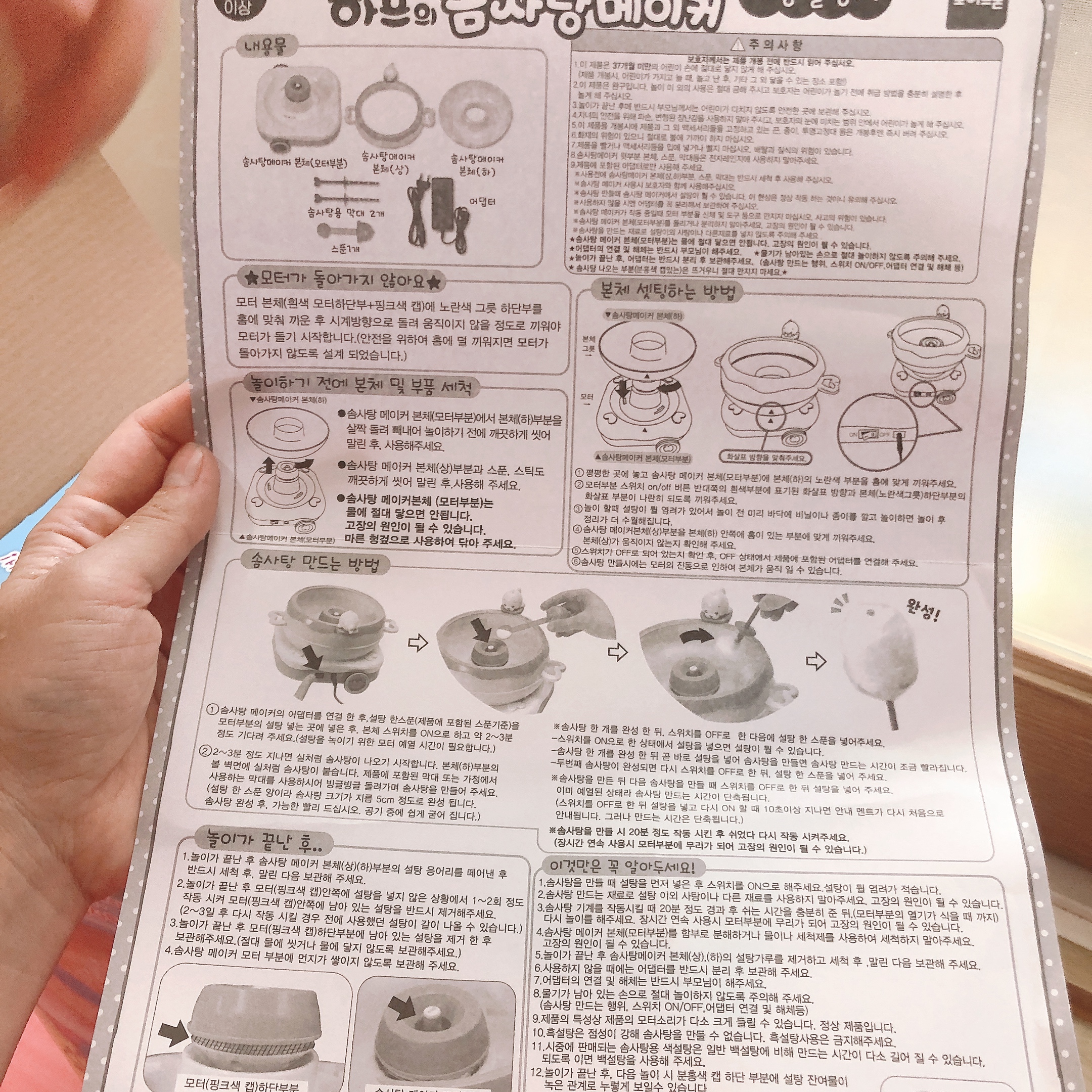 하프의 솜사탕 메이커 설명서도 들어있는데 구성품 안내, 부품 세척 방법, 놀이 전 세팅 방법, 솜사탕 만드는 방법, 놀이가 끝난 후 관리 방법, 주의사항 등이 친절하고 꼼꼼하게 씌여 있었다.