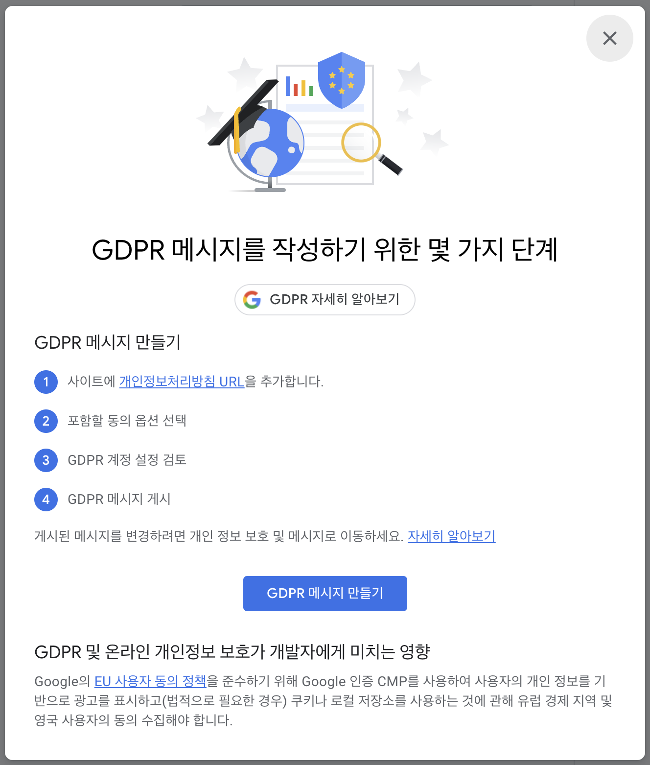 GDPR 메시지를 만들기 위한 단계에 대한 설명 팝업이 뜬다. 팝업 안에 있는 GDPR 메시지 만들기 버튼을 한 번 더 클릭한다.