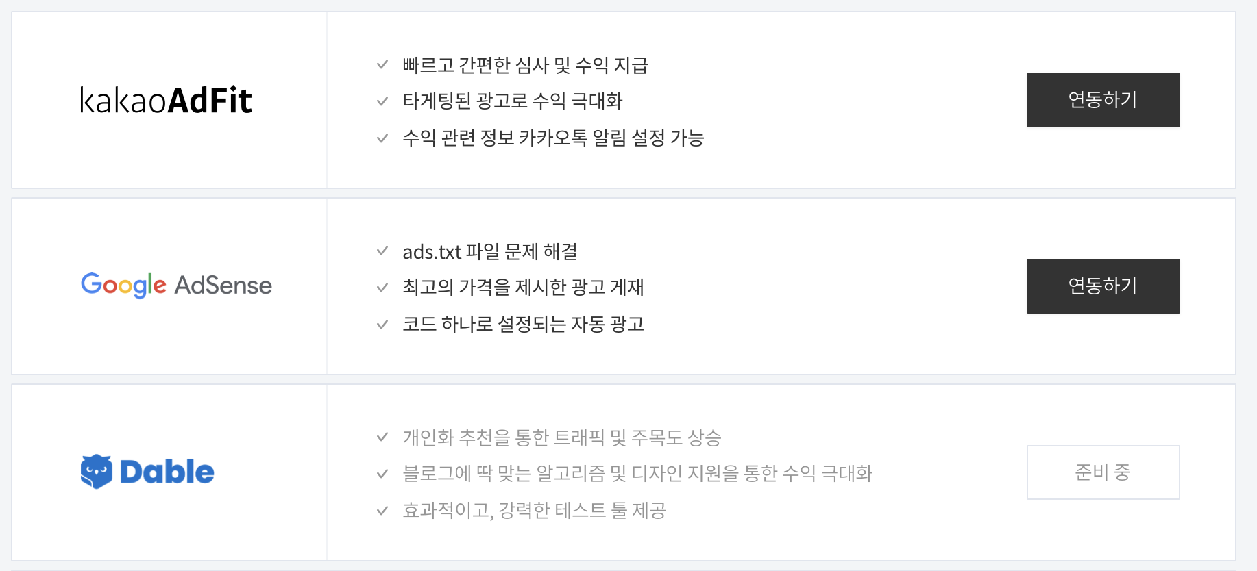 우측에 보면 카카오 애드핏, 구글 애드센스, 데이블 등의 리스트가 있다. 나는 구글 애드센스만 연동할 예정이기 때문에 Google Adsense 박스 우측의 '연동하기' 버튼을 클릭했다.