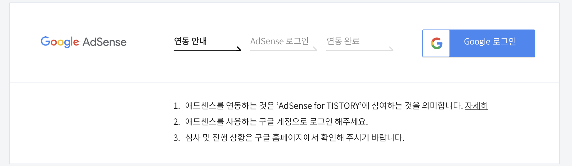★중요★ 티스토리에서 제공하는 애드센스 연동 기능은 심사를 포함하고 있지 않다. 그렇기 때문에 이미 승인이 완료된 구글 계정을 연동해야 한다.