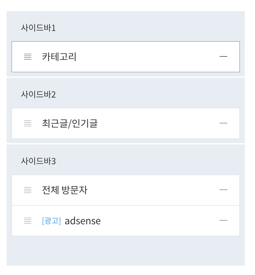 미리보기를 통해 어떻게 보여지는지도 확인이 가능하다. 사이드바를 선택하면 처음에 애드센스 배너가 가장 위쪽에 위치하는데, 나는 개인적으로 '카테고리 → 최근글/인기글 → 전체 방문자 → 애드센스 배너'의 순서로 보여졌으면 했다. 사이드바에 게재되는 애드센스 배너 위치는 어드민 > 꾸미기 > 사이드바에서 변경할 수 있다.