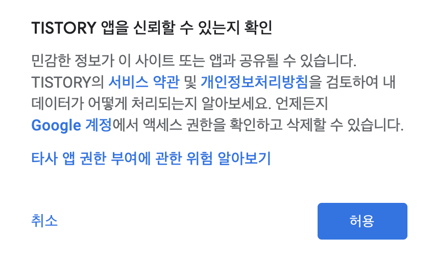 티스토리에 권한 부여 메세지를 둘다 허용해주고, 마지막으로 티스토리 앱 신뢰 확인까지 마치면 연동이 완료된다.
