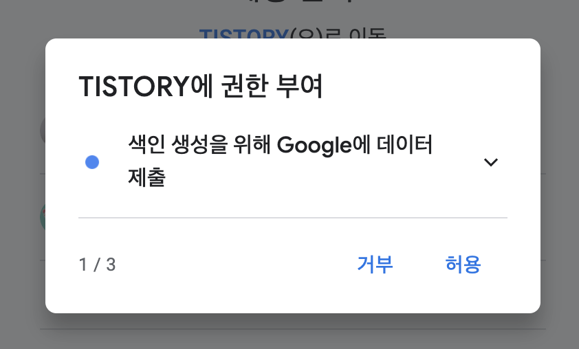 계정 연결하기 버튼을 클릭하면, 구글 계정을 선택 or 로그인 하라는 팝업창이 뜬다. 나는 평소 사용하는 지메일 계정을 선택했다. 티스토리 권한 부여를 선택할 수 있는 알림창 3개에 차례로 ''허용"을 클릭하고, 마지막으로 최종 확인을 한다.