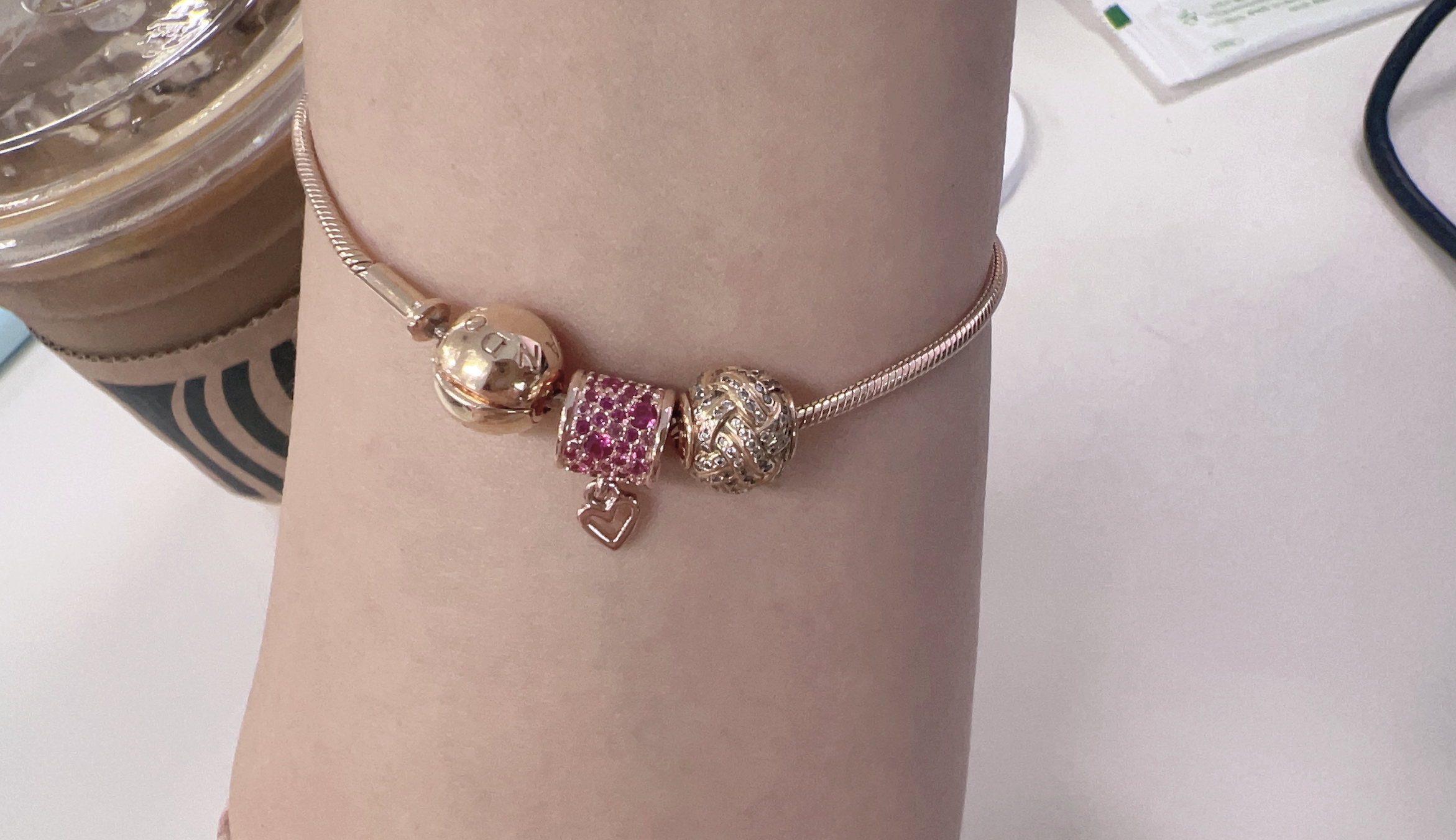 이 판도라 참은 로즈 골드 도금이라서 웜톤 스타일에 추천한다. 팔찌 줄의 사이즈에 상관없이 모두 자유롭게 착용이 가능할것으로 판단된다. 기존에 가지고 있던 팔찌에 끼우니 원래부터 세트였던 것처럼 너무 잘 어울려서 감동했다.
