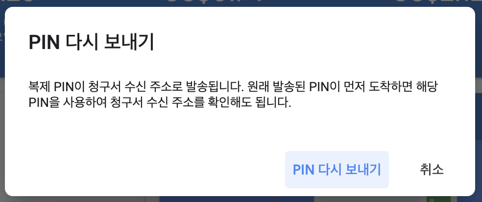 애드센스 홈페이지 첫화면에서 청구서 수신 주소 확인 카드를 찾아서 '확인' 버튼을 누른다. 그러면 PIN 번호를 입력하라는 메세지와 함께 화면이 바뀌는데 아랫 부분의 'PIN 다시 보내기'를 선택한다.