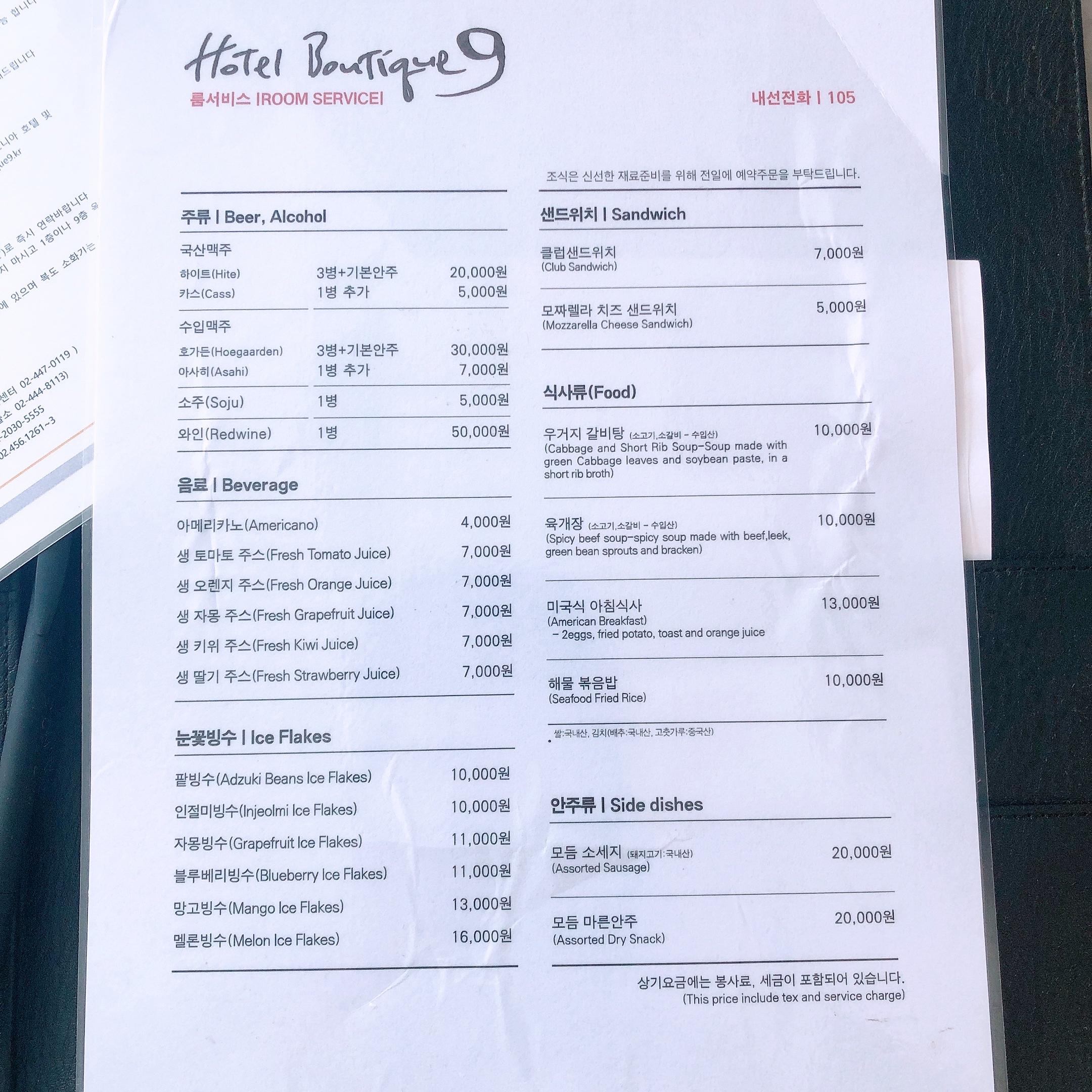 룸서비스로는 주류, 음료, 눈꽃빙수, 샌드위치 등 간단한 카페 메뉴와 우거지 갈비탕, 육개장, 미국식 아침식사, 해물볶음밥 등 식사 메뉴, 모듬 소시지나 모듬 마른안주 같은 안주 메뉴가 가능하다. 금액이 비싼 편은 아닌 것 같다. 아이들이 눈꽃빙수를 좋아할 것 같아서 주문해보려고 했는데 2박 3일 내내 정신이 없어서 깜박했다. 다음에 또 숙박할 기회가 생기면 그 때는 이것저것 주문해서 먹어봐야겠다.