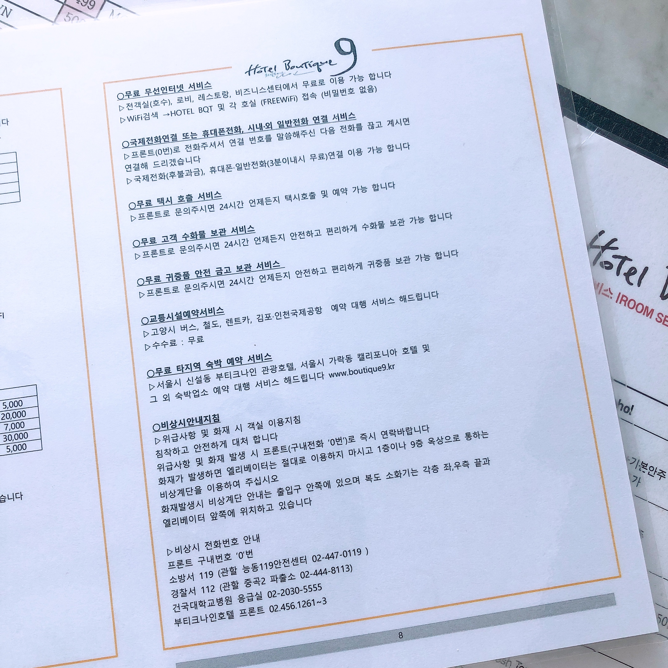 테이블 위에 놓여있는 파일을 펼치면 간단한 필기도구가 들어 있고, 각종 룸서비스 목록과 주문가능한 음식 메뉴를 확인할 수 있다. 와이파이는 비밀번호가 따로 지정되어 있지 않으니 그냥 호수를 선택하면 된다. 프론트로 문의를 하면 무료로 택시 호출 및 예약을 할 수 있으며, 24시간 언제든지 안전하고 편리하게 수화물, 귀중품을 보관할 수 있다.