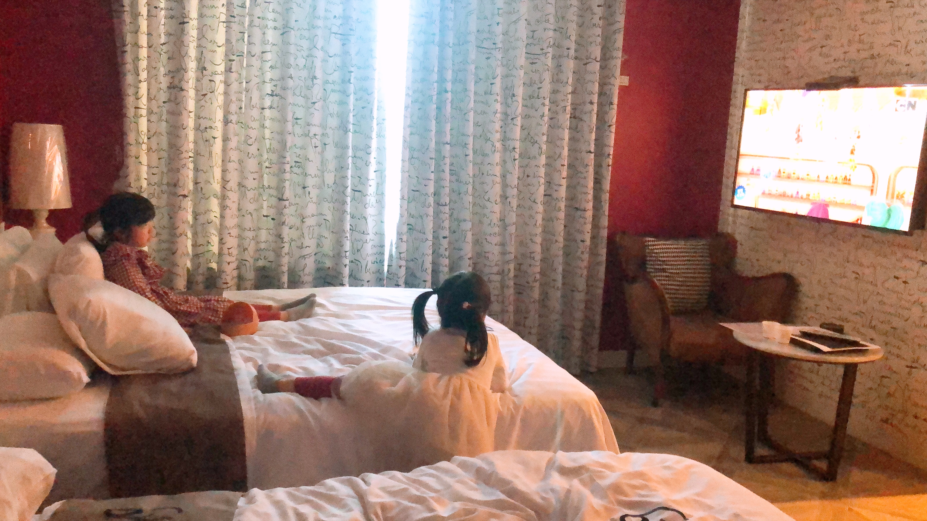 객실 카드를 받아 엘리베이터를 타고 올라왔는데 웨스턴룸의 첫인상은 '햇빛이 잘 드는 환하고 따뜻한 공간'이었다. 면적이 33제곱미터(10평)로 꽤 큰 편이다. 침대와 테이블 등 가구 몇개를 놓고도 공간이 꽤 많이 남아 아이들이 바닥에서 다양한 놀이를 하며 놀 수 있었다.