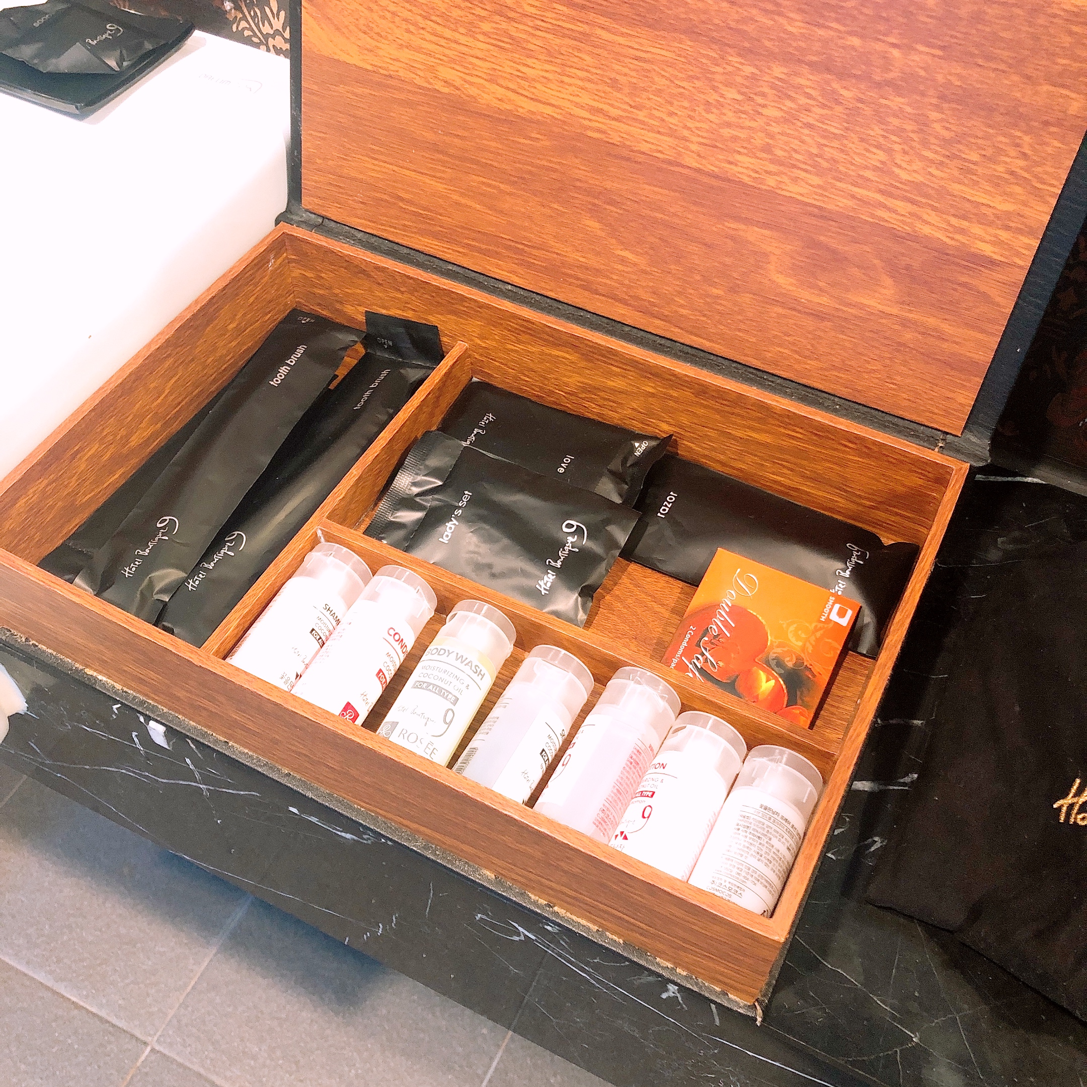 칫솔, 치약, 샴푸, 린스, 바디워시부터 머리빗, 화장솜까지 전반적인 어메니티가 모두 구비되어 있다. 세면도구 걱정할 필요 없이 의류만 챙겨서 가면 되니까 정말 간편하다. 만약 아이와 동행하는 경우 어린이 칫솔, 치약은 당연히 없으므로 따로 챙겨야 한다. 아이들은 피부가 예민하니 보습제 등 평소에 사용하던 제품도 함께 가져가는 것을 추천한다.
