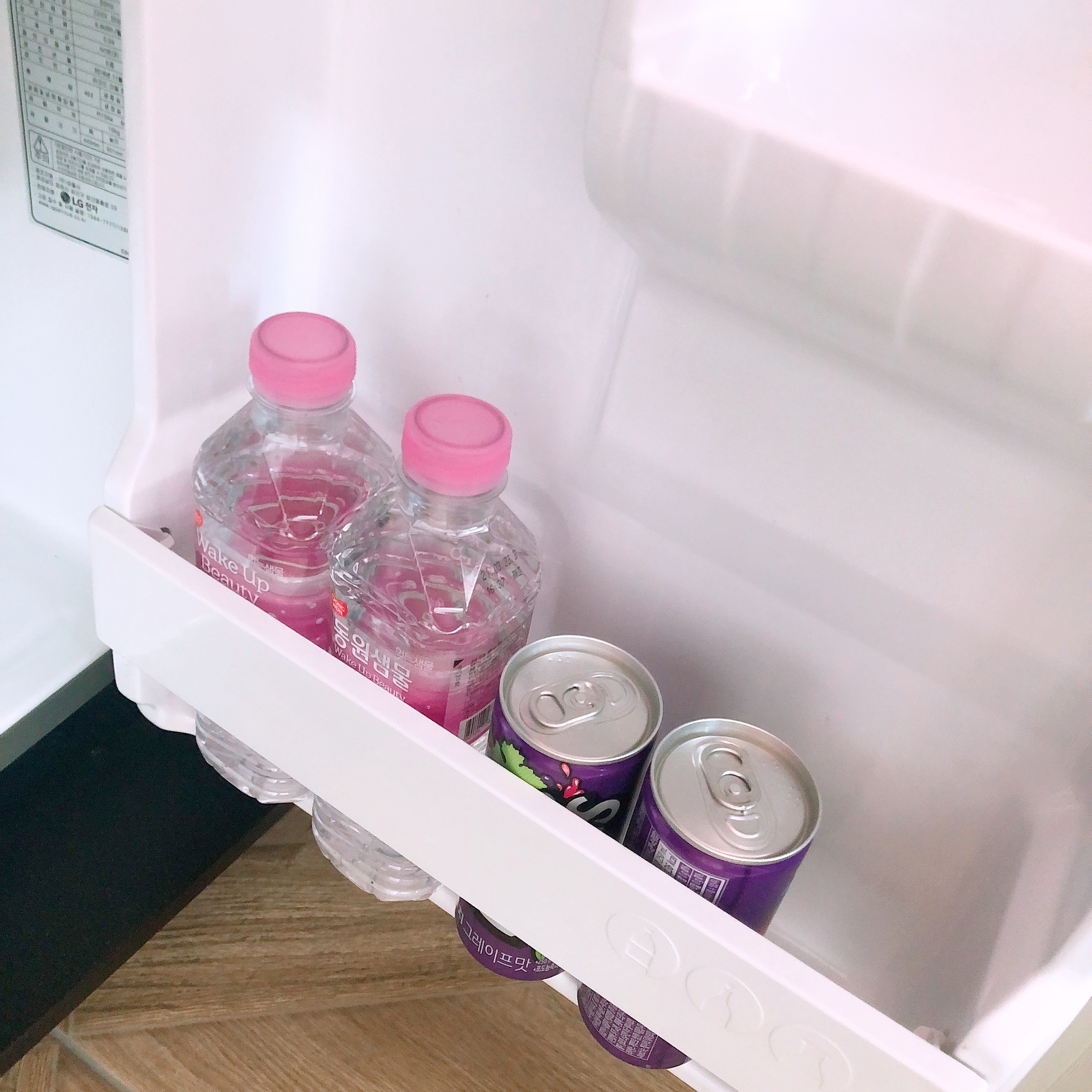 침대 옆으로는 옷걸이, 수건, 가운, 냉장고 등이 있다. 냉장고 문을 열어보니 캔음료 2개와 생수 2병이 들어 있었다.