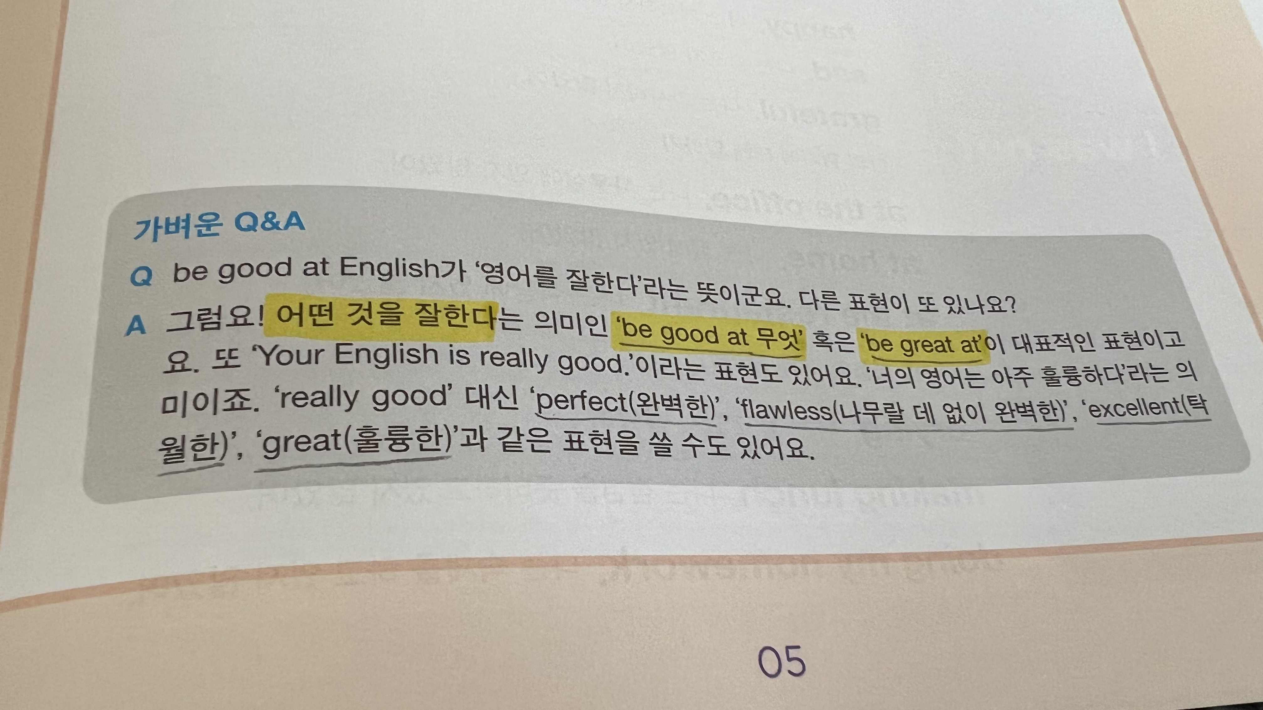 어떤 것을 잘한다고 표현할 때에 be good at ~ 또는 be great at ~ 이라는 표현을 쓰는데 이것은 그냥 통째로 외워버리는 게 나을 것 같다.