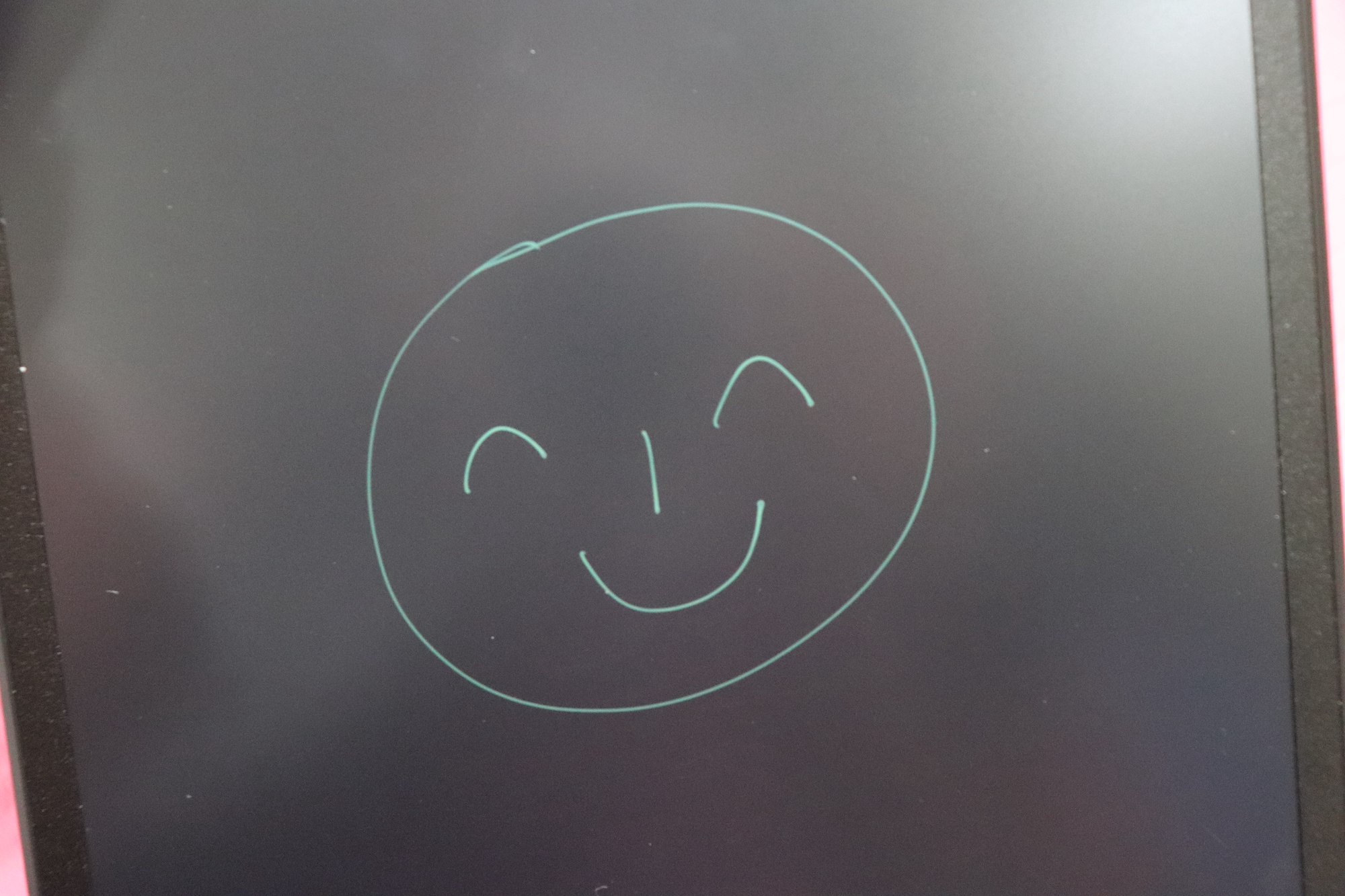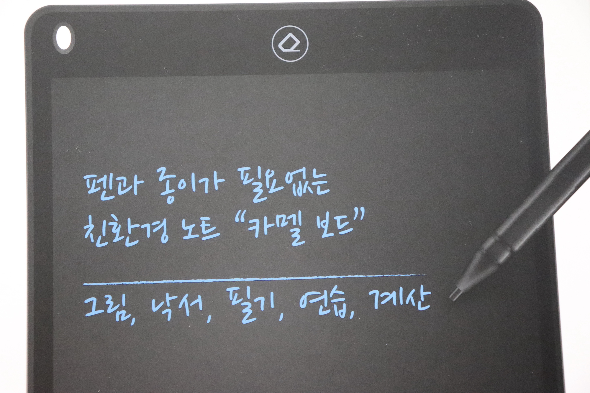 전용펜으로 필기공간에 메모 or 그림을 그리고 지움버튼을 누르면 필기공간에 남아있는 메모 또는 그림을 지울 수 있다. 전용펜 그립감도 합격! 필기감도 합격! 모두 합격! 처음에는 선이 다소 얇게 나올 수 있는데 시간이 지나면서 부드러운 필기감으로 두께조절이 자유롭게 표현된다고 하니 아마도 사용할 수록 만족도가 더 높아질 듯 하다. 그리고 카멜보드는 전자파가 나오지 않으며, 녹색으로 표현되는 글과 그림이 눈 건강에 도움을 준다는 점도 마음에 쏙 든다.