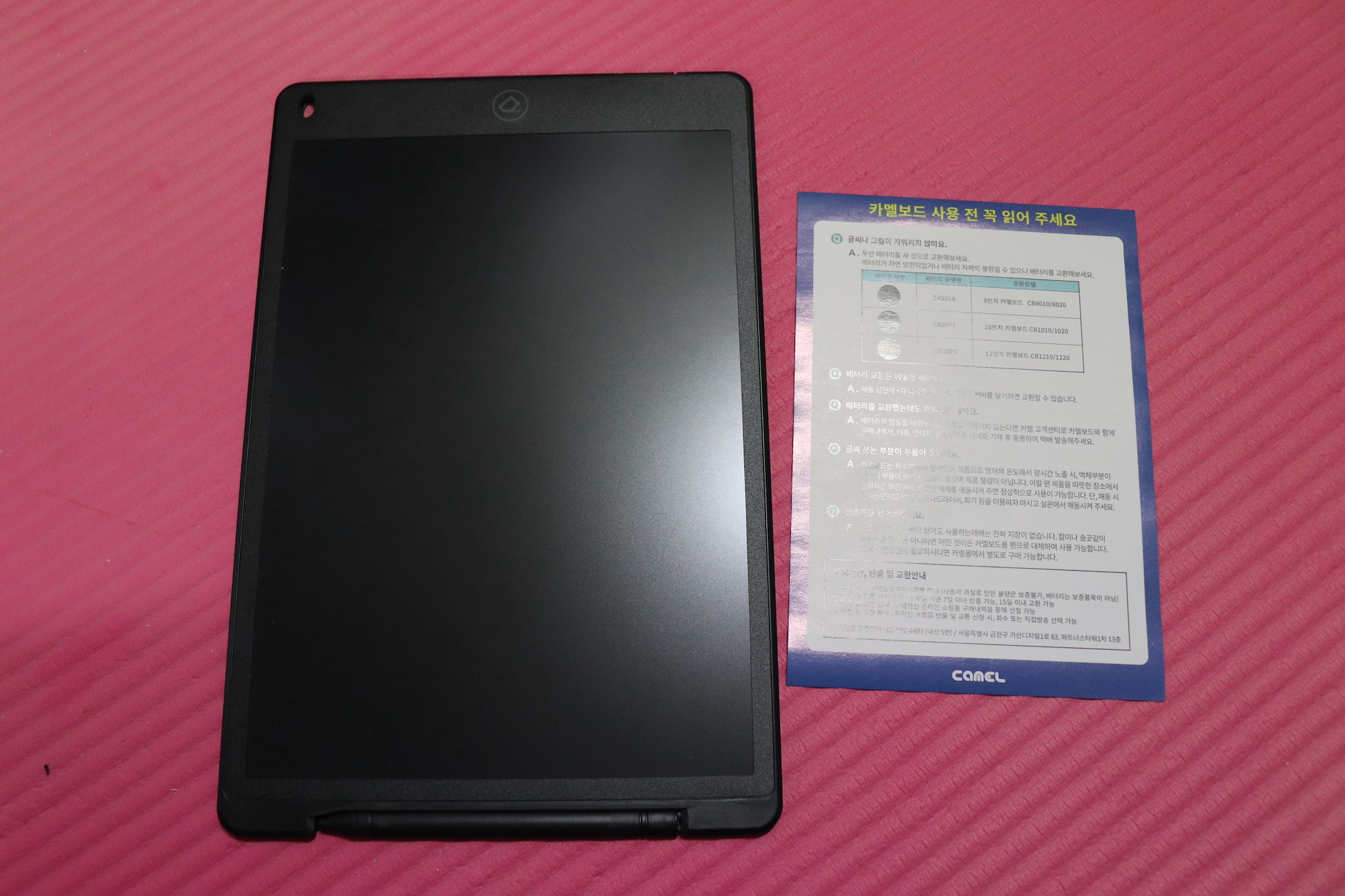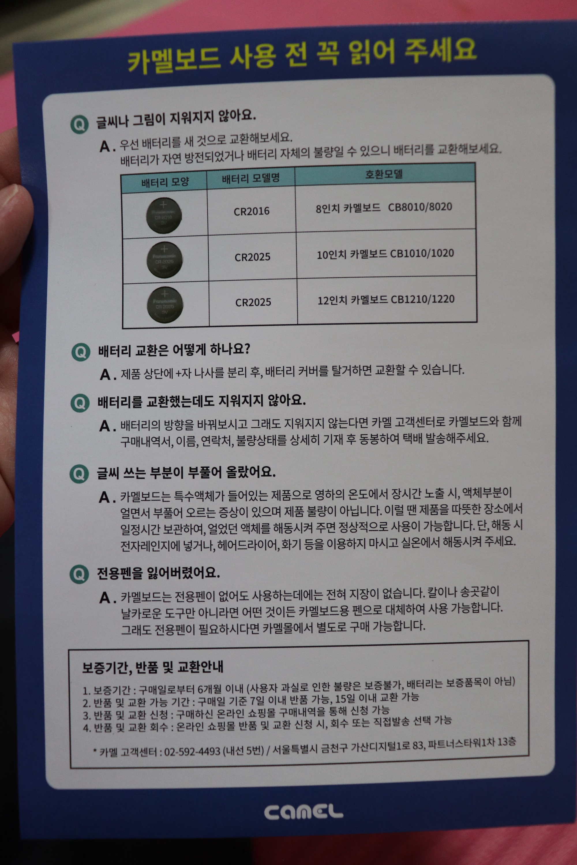 카멜보드와 함께 사용 전 꼭 읽어달라는 설명서 한 장이 동봉되어 있다. 배터리를 교환하는 방법과 고장으로 의심되는 상황에 대한 설명이 자세하게 적혀 있었다. 카멜보드는 특수액체가 들어있는 제품으로 추운 곳에서 장시간 보관하면 액체 부분이 얼어 부풀어 오를 수 있는데, 다시 실온에서 해동시키면 (전자레인지, 헤어드라이기, 화기 등 사용 x) 다시 사용할 수 있다고 한다.