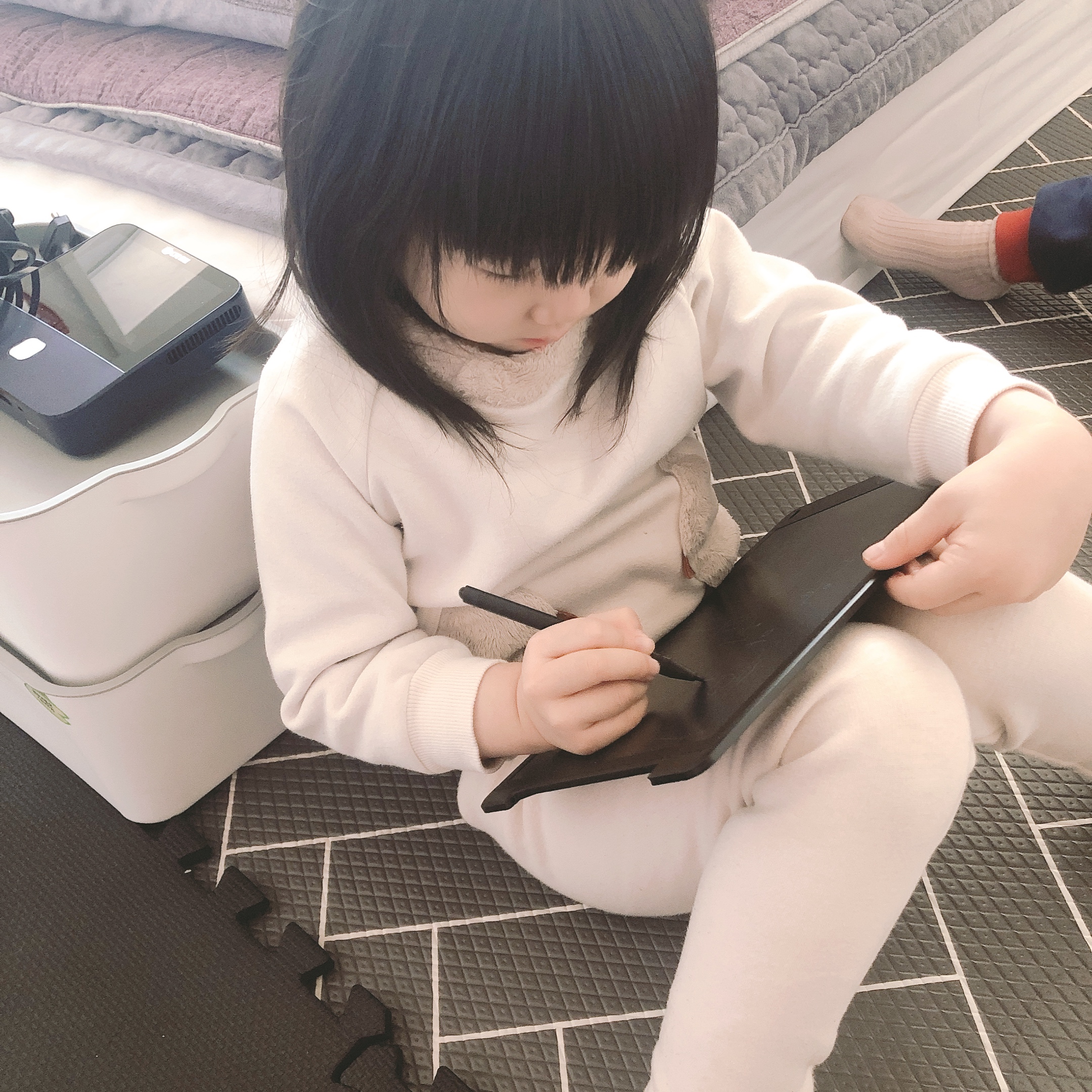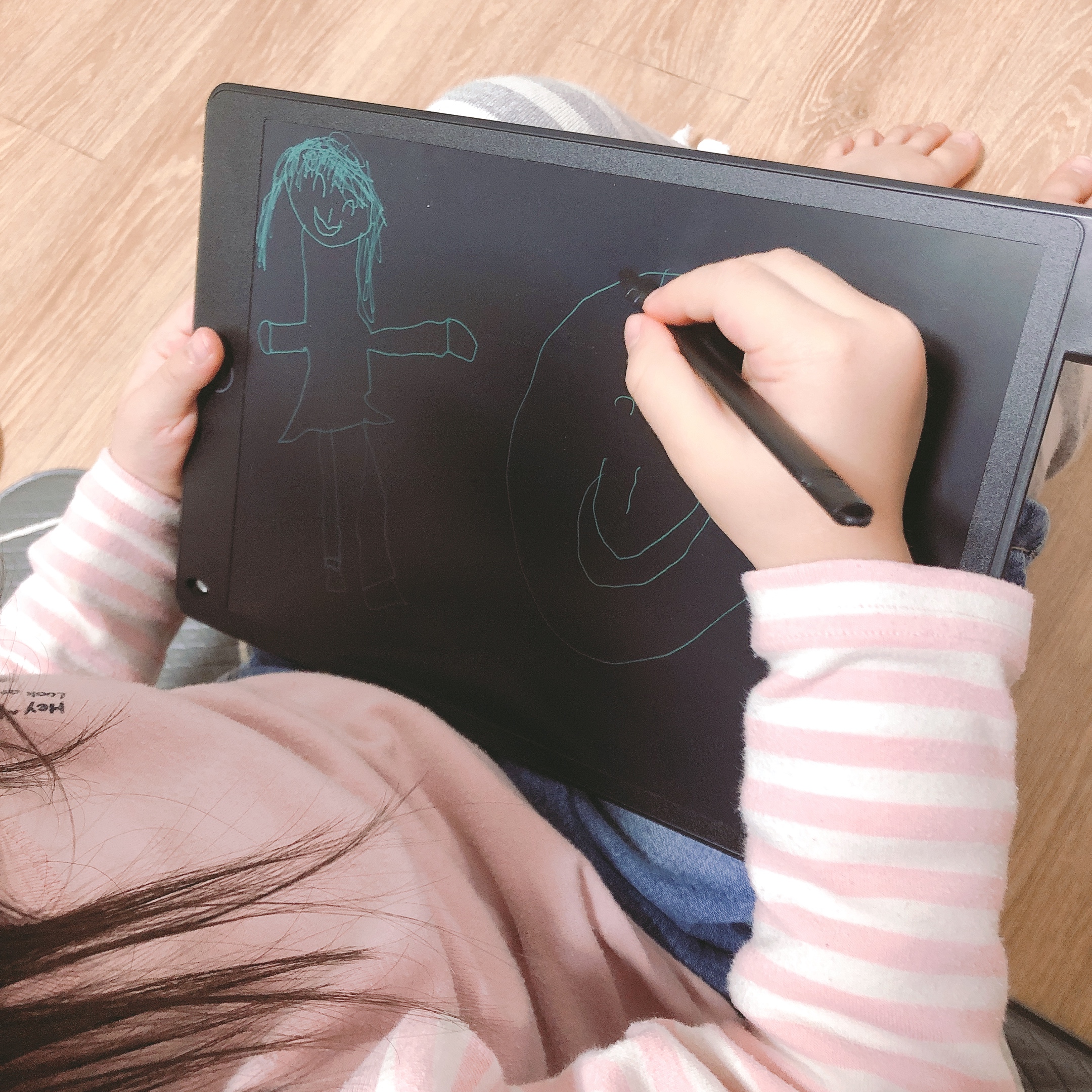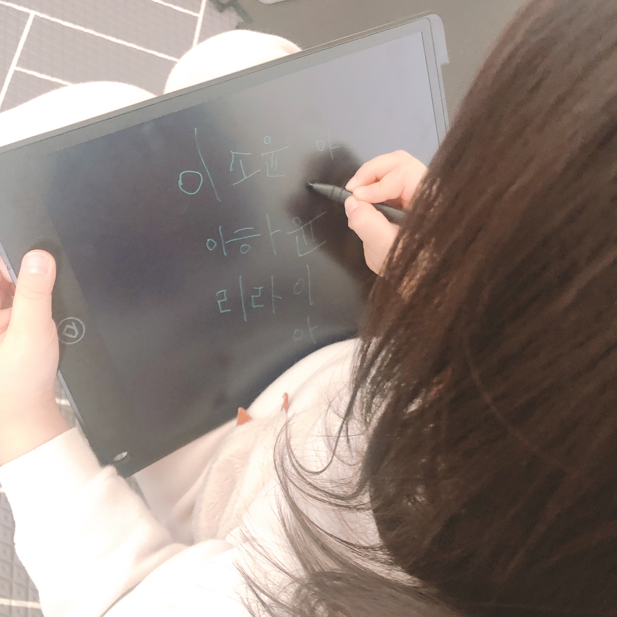그림도 그리고 글씨도 쓰고 5분만에 종이가 절약되는 것을 체감했다. 색을 칠할 수 없다는 것은 아쉽지만, 썼다 지웠다 하는 게 흥미로운가보다. (계속 뭘 쓰고 그리고 다시 지우고 쓰고 반복) 워낙 다작을 하는 그녀들이라 카멜보드가 마음에 드는지 한참동안 전용펜을 손에서 놓지 않았다. 그걸 보고 있는 나도 기분이 좋았다. 이 포스팅을 쓰는 지금도 그녀들의 책상 위에 검정색 카멜 보드가 한개씩 놓여있다.