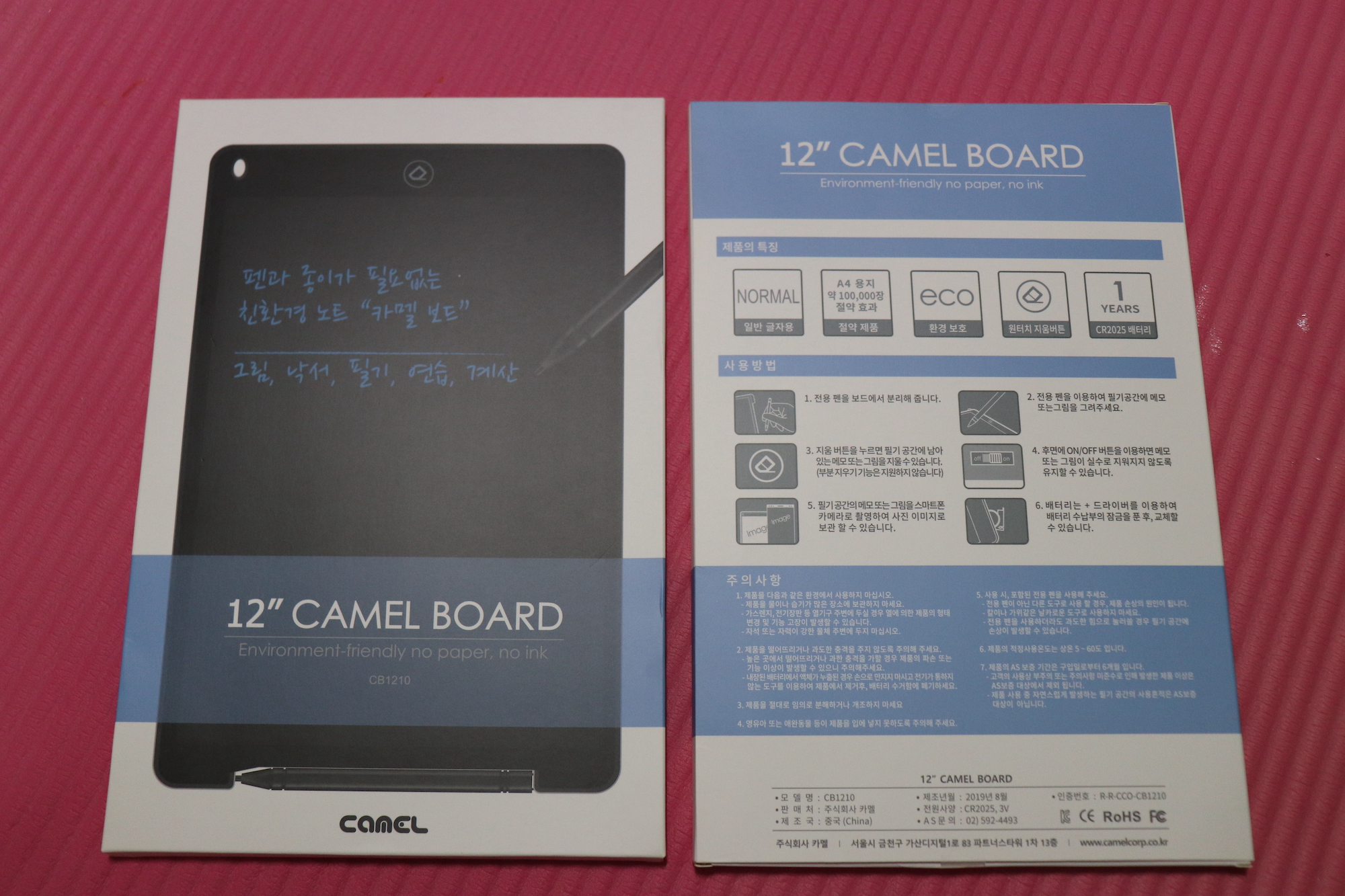 카멜보드는 동그란 CR2025 배터리 하나를 넣어 작동하는데, 다 쓰고 나서 원터치 지움 버튼 하나만 누르면 언제 썼냐는 듯 보드를 처음 상태로 되돌릴 수 있다. A4 용지 약 100,000장 절약 효과가 있다고 하니, 전세계적으로 환경오염이 심각한 문제로 떠오르고 있는 요즘 시대에 딱 알맞은 아이템이라는 생각이 든다. 참고로 A4용지 100,000장을 절감하는 것은 나무 3그루를 보호하는 것과 같은 효과라고 한다. (수지니 이모가 방금 나무 6그루를 구했습니다...)