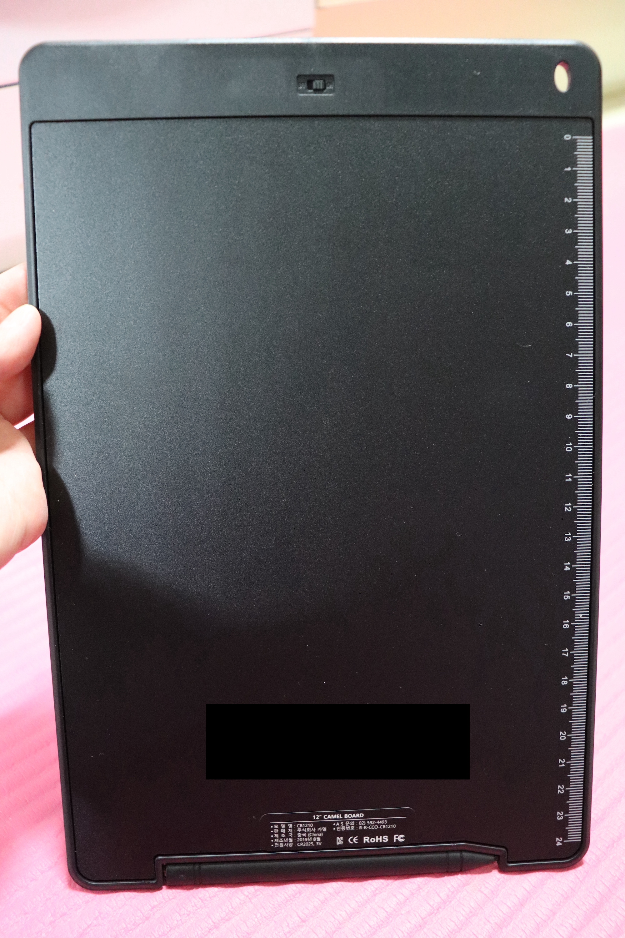 보드 아래쪽에는 전용펜이 꽂혀 있는데 아래로 당겨서 분리할 수 있다. 또 세로면을 따라서 24cm까지 눈금이 표시되어 있어 길이를 잴 때도 유용하다. 나는 카멜 보드 뒷면을 보고 마우스패드로 사용하면 딱일 것 같다는 생각을 했는데, 아이들 글씨 or 그림 연습 뿐만 아니라 내가 업무 볼 때에도 효율적인 사용이 가능할 것 같다는 생각이 들었다. (얘들아, 엄마가 너희들의 카멜 보드를 탐내고 있어+_+)