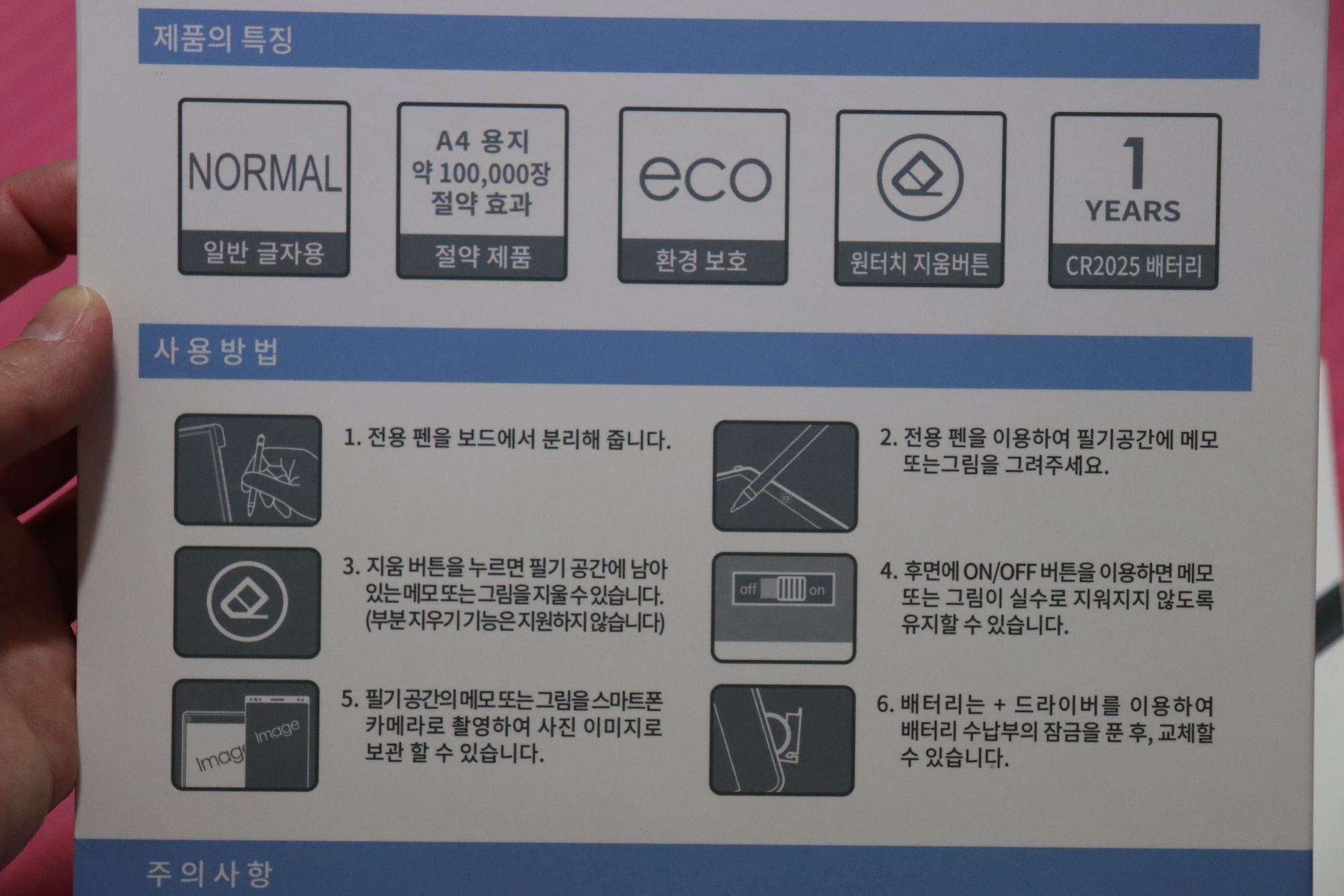 카멜보드는 동그란 CR2025 배터리 하나를 넣어 작동하는데, 다 쓰고 나서 원터치 지움 버튼 하나만 누르면 언제 썼냐는 듯 보드를 처음 상태로 되돌릴 수 있다. A4 용지 약 100,000장 절약 효과가 있다고 하니, 전세계적으로 환경오염이 심각한 문제로 떠오르고 있는 요즘 시대에 딱 알맞은 아이템이라는 생각이 든다. 참고로 A4용지 100,000장을 절감하는 것은 나무 3그루를 보호하는 것과 같은 효과라고 한다. (수지니 이모가 방금 나무 6그루를 구했습니다...)