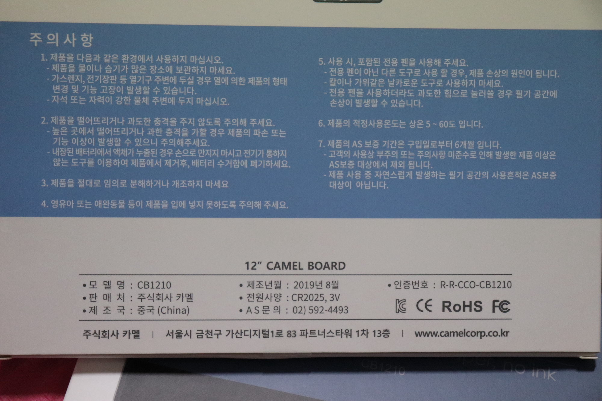 카멜보드와 함께 사용 전 꼭 읽어달라는 설명서 한 장이 동봉되어 있다. 배터리를 교환하는 방법과 고장으로 의심되는 상황에 대한 설명이 자세하게 적혀 있었다. 카멜보드는 특수액체가 들어있는 제품으로 추운 곳에서 장시간 보관하면 액체 부분이 얼어 부풀어 오를 수 있는데, 다시 실온에서 해동시키면 (전자레인지, 헤어드라이기, 화기 등 사용 x) 다시 사용할 수 있다고 한다.