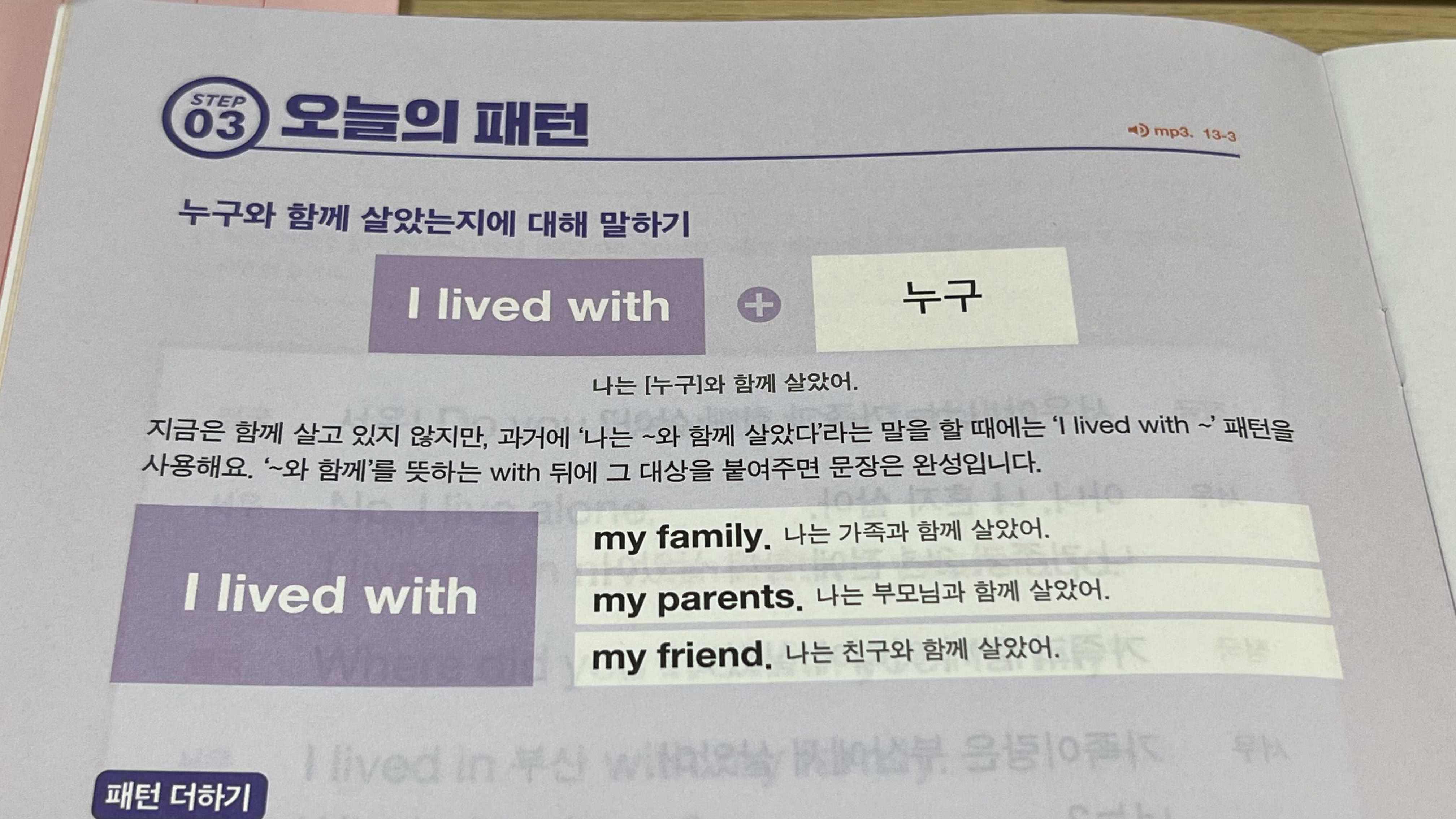 기본 문장은 'I lived with ~'로 누구와 함께 살았는지 알려주는 것이지만 기본 문장을 응용하여 어디에서 살았는지, 어디 근처에 살았는지, 또 무엇을 마시고, 무엇을 계획했는지 등 다양한 과거시제 문장을 말해볼 수 있다.