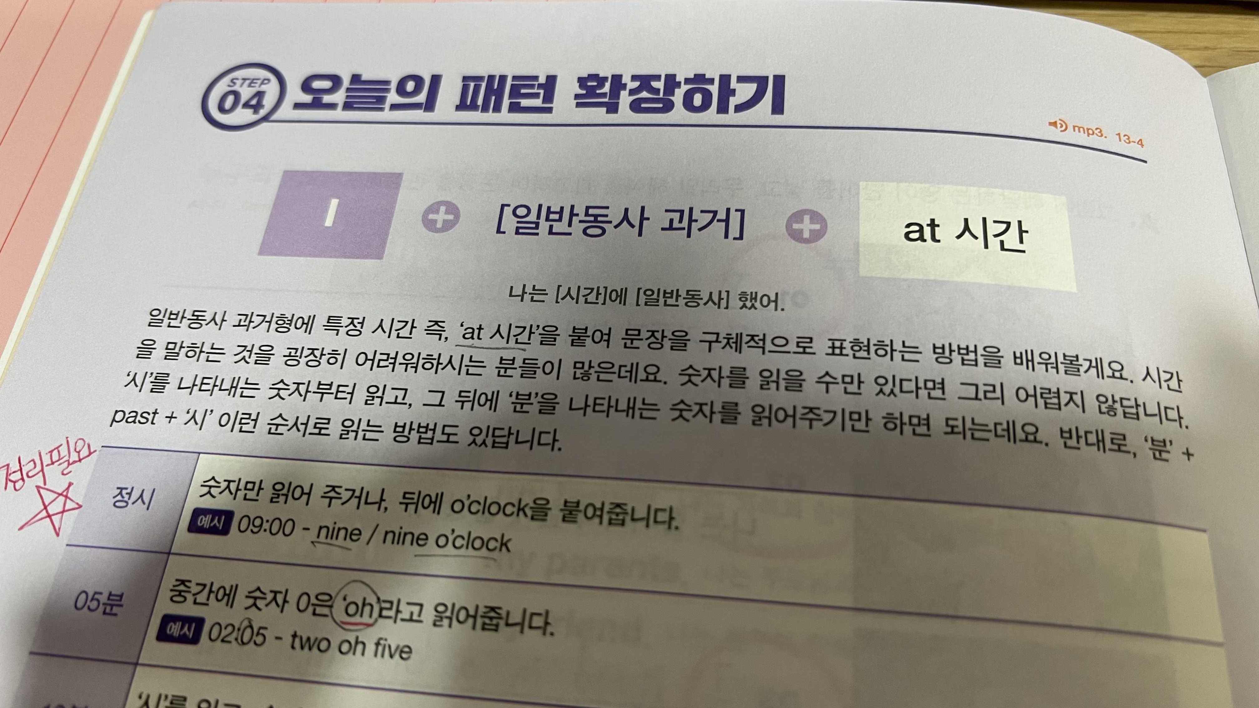 문장 뒤에 'at 시간'을 붙여서 좀 더 자세한 설명을 할 수 있다. 나는 정시를 가리키는 9 o'clock과 시-분의 숫자를 이어서 말하는 시간 표현 방식은 알고 있었지만 ~ oh ~, half past ~, quarter to ~ 등의 표현은 이번에 처음으로 알게 되었다. 그래서 복습을 위해 메모패드에 따로 정리해 두었다.