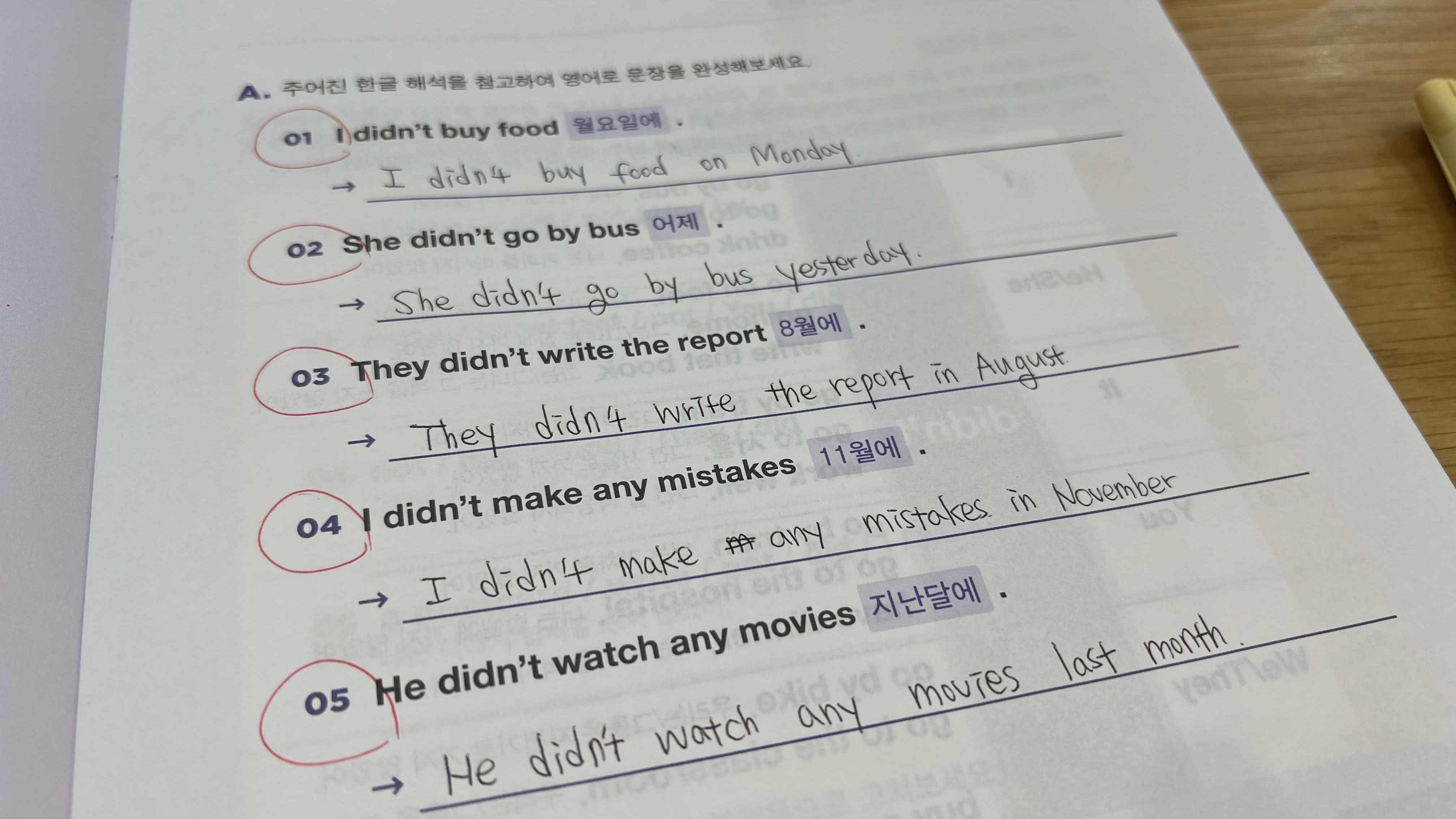 과거시제 부정문은 '~했어' 하는 일반 과거시제 문장 만큼이나 많이, 자주 사용하는 표현이다. 이번 주차 교재도 문제를 풀면서 모든 문장을 따라 읽어보고 자연스럽게 회화로 이어질 수 있도록 신경을 많이 썼다. 효과가 있을지는 잘 모르겠지만... 그래도 안 하는 것보다는 낫겠지... 라는 믿음으로...!