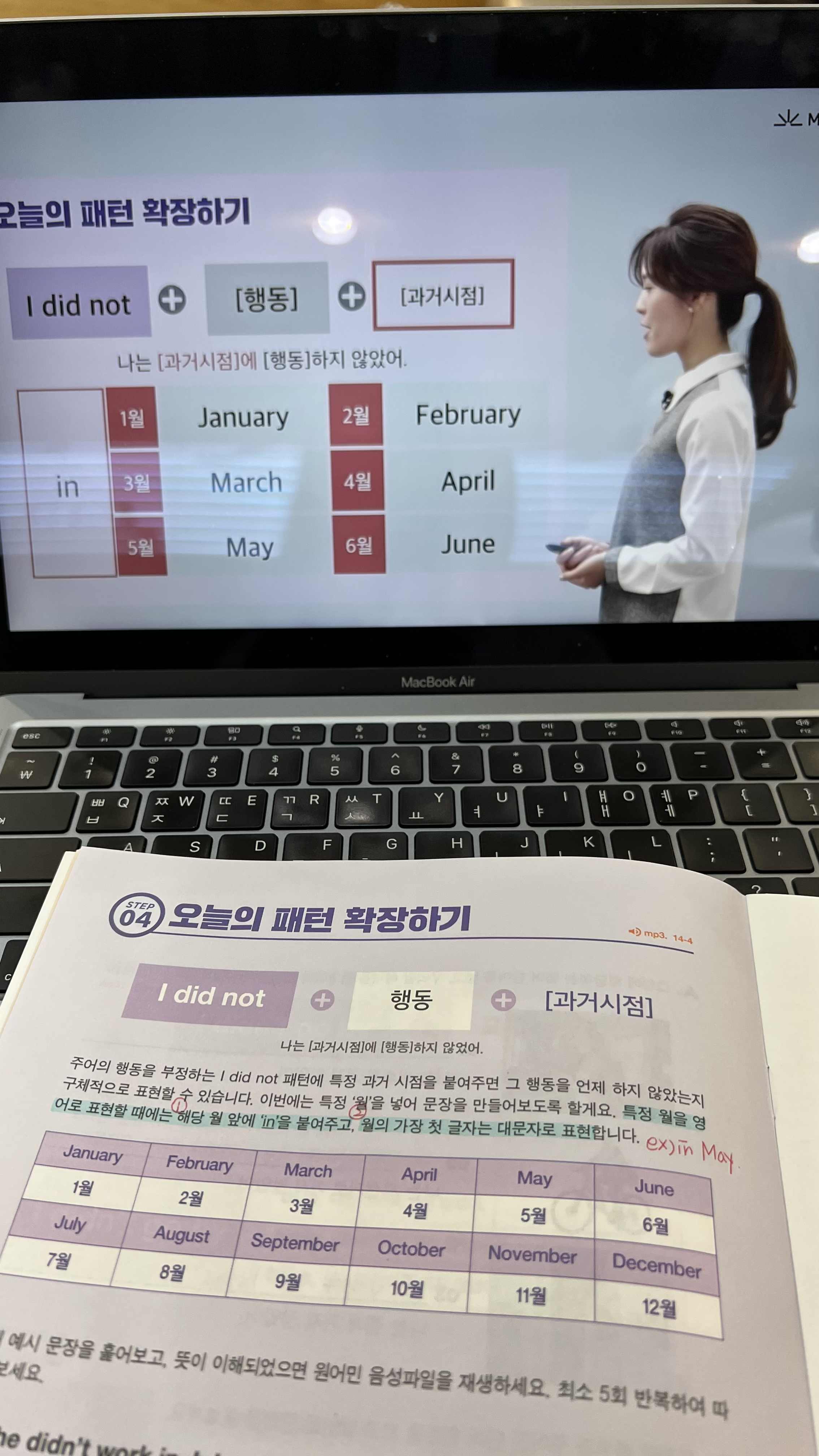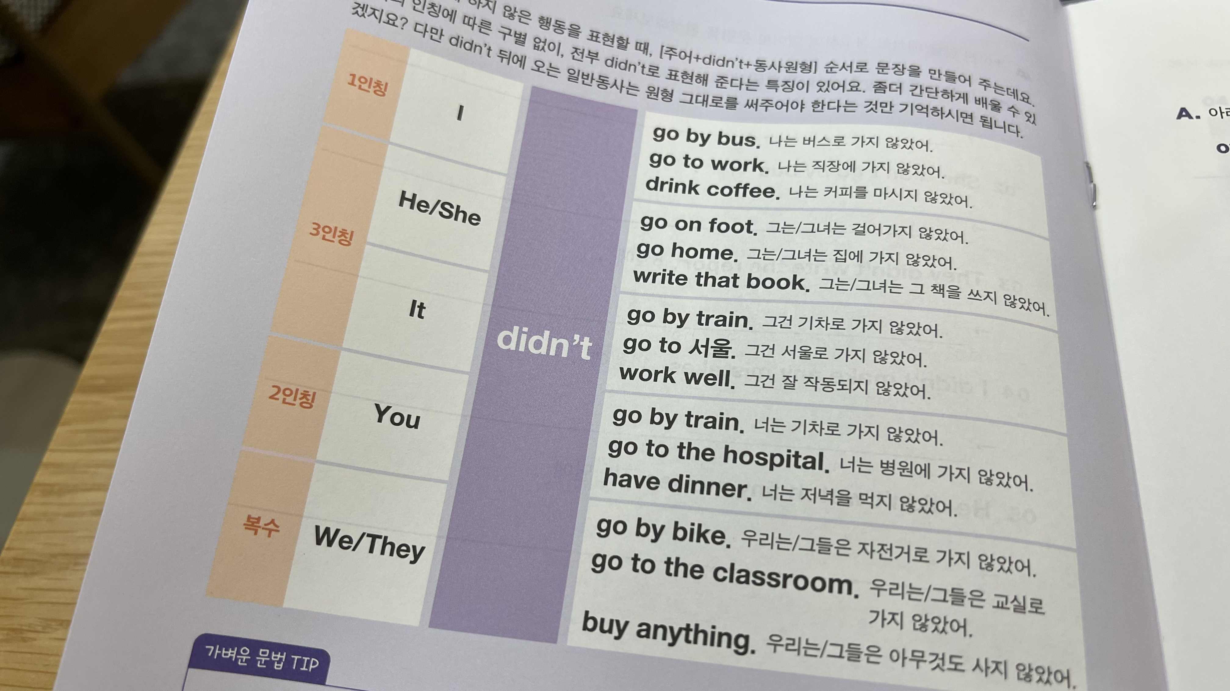 과거시제 부정문은 '~했어' 하는 일반 과거시제 문장 만큼이나 많이, 자주 사용하는 표현이다. 이번 주차 교재도 문제를 풀면서 모든 문장을 따라 읽어보고 자연스럽게 회화로 이어질 수 있도록 신경을 많이 썼다. 효과가 있을지는 잘 모르겠지만... 그래도 안 하는 것보다는 낫겠지... 라는 믿음으로...!