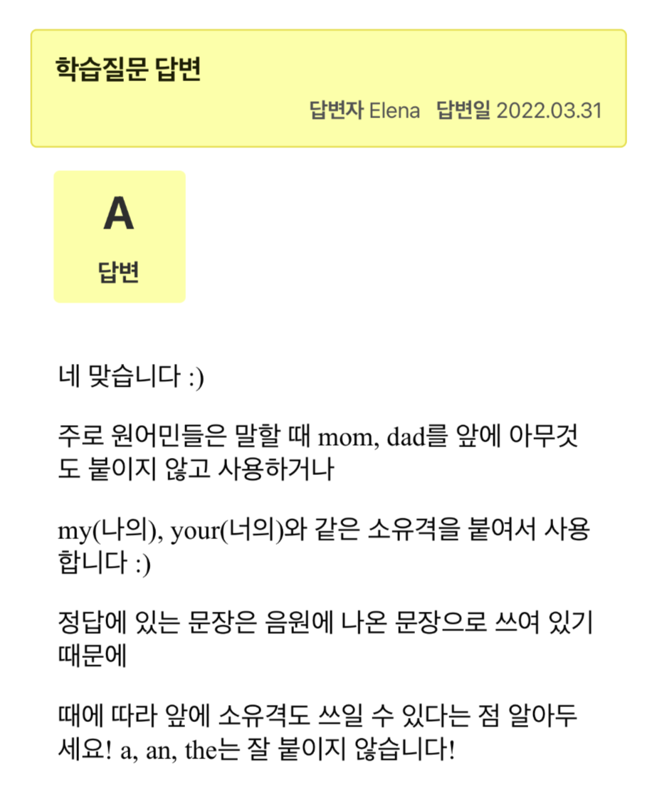 그리고 다음 날 답변을 받았다. 주로 원어민들은 말할 때에 mom, dad 앞에는 아무것도 붙이지 않고 사용할 때가 있다고 한다. 음... 이런 소소한 팁들은 가벼운 학습지 질문답변방을 이용해서 얻을 수 있는 추가 장점인 것 같다. 이렇게 18주차 영어공부 끝!