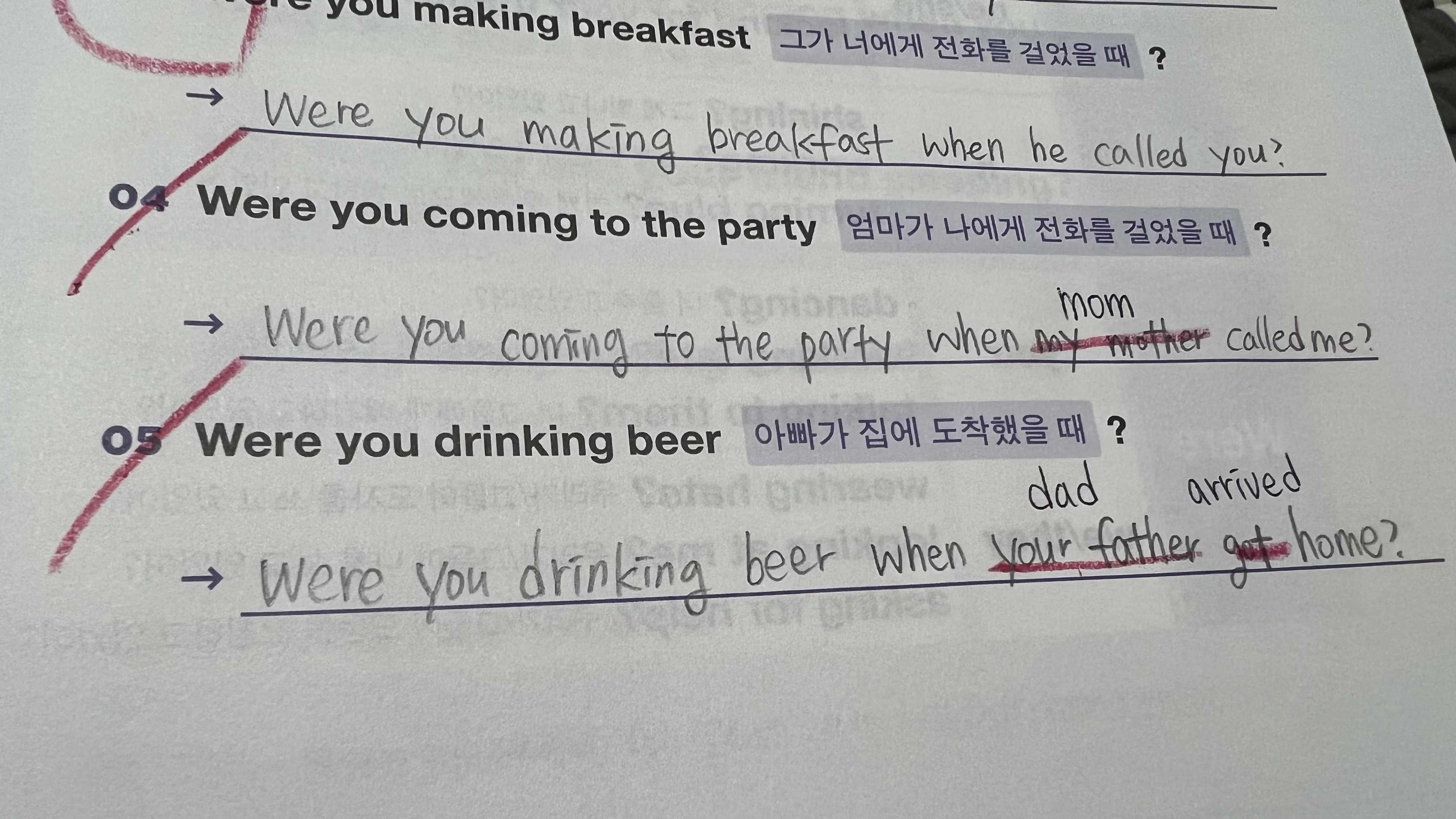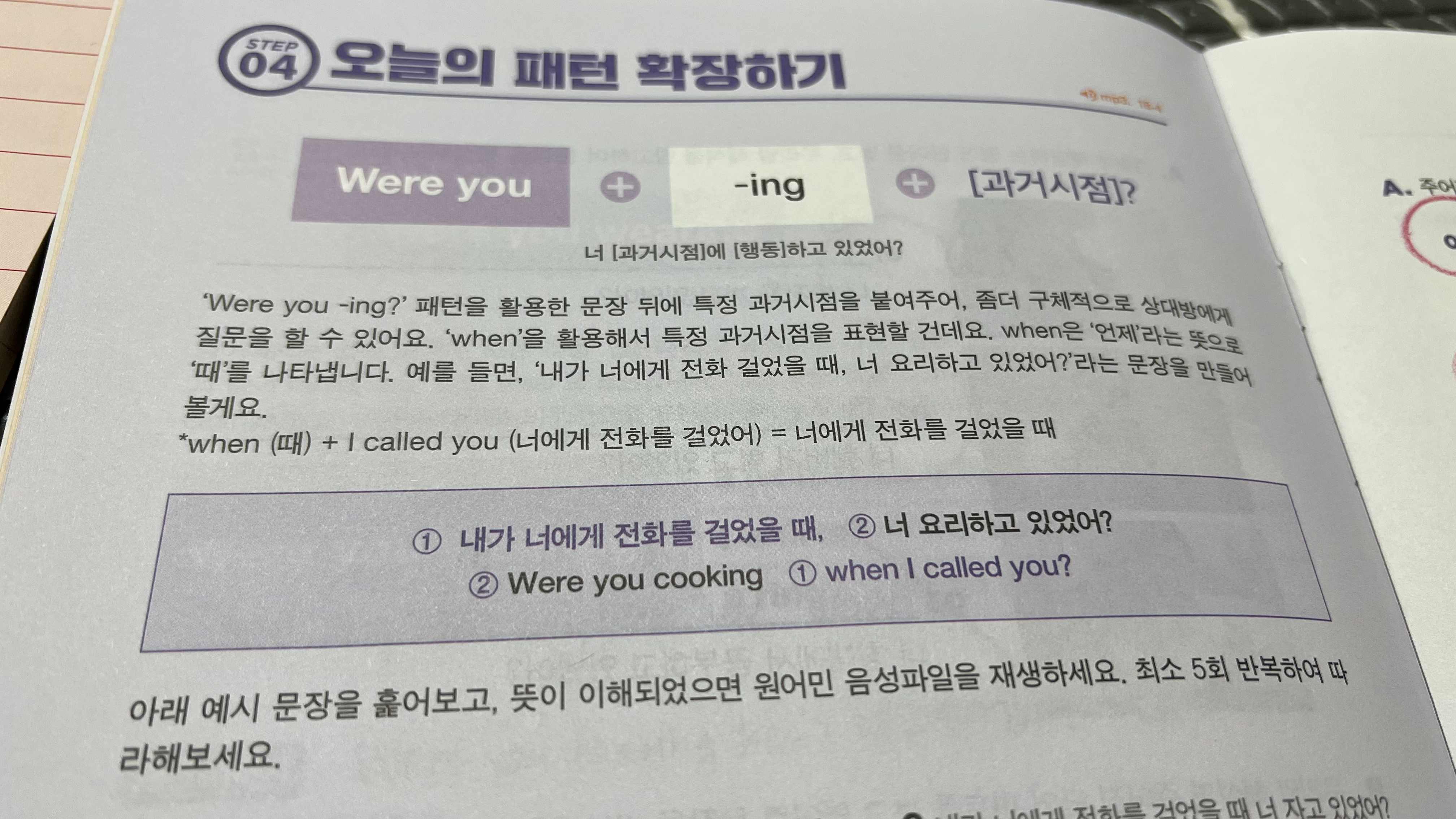 오늘의 패턴 확장하기에서는 'when'을 사용하여 특정 과거시점을 문장 뒤에 붙이는 방법을 배웠다. When 뒤에 문장을 쓰면 '~ 했을 때' 라는 표현이 된다. 예를 들어 Were you cooking when I called you? 라는 문장은 내가 너에게 전화 걸었을 때, 너 요리하고 있었어? 라고 해석할 수 있다.