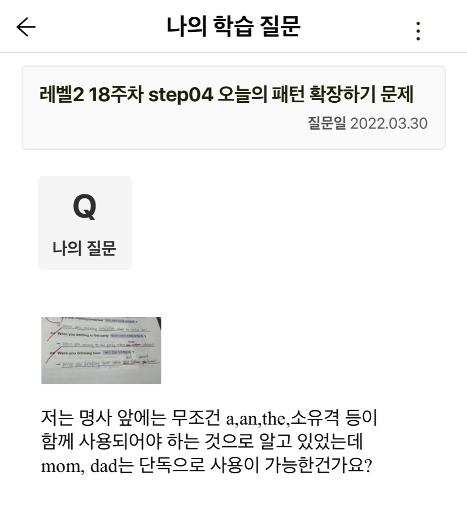 그리고 다음 날 답변을 받았다. 주로 원어민들은 말할 때에 mom, dad 앞에는 아무것도 붙이지 않고 사용할 때가 있다고 한다. 음... 이런 소소한 팁들은 가벼운 학습지 질문답변방을 이용해서 얻을 수 있는 추가 장점인 것 같다. 이렇게 18주차 영어공부 끝!