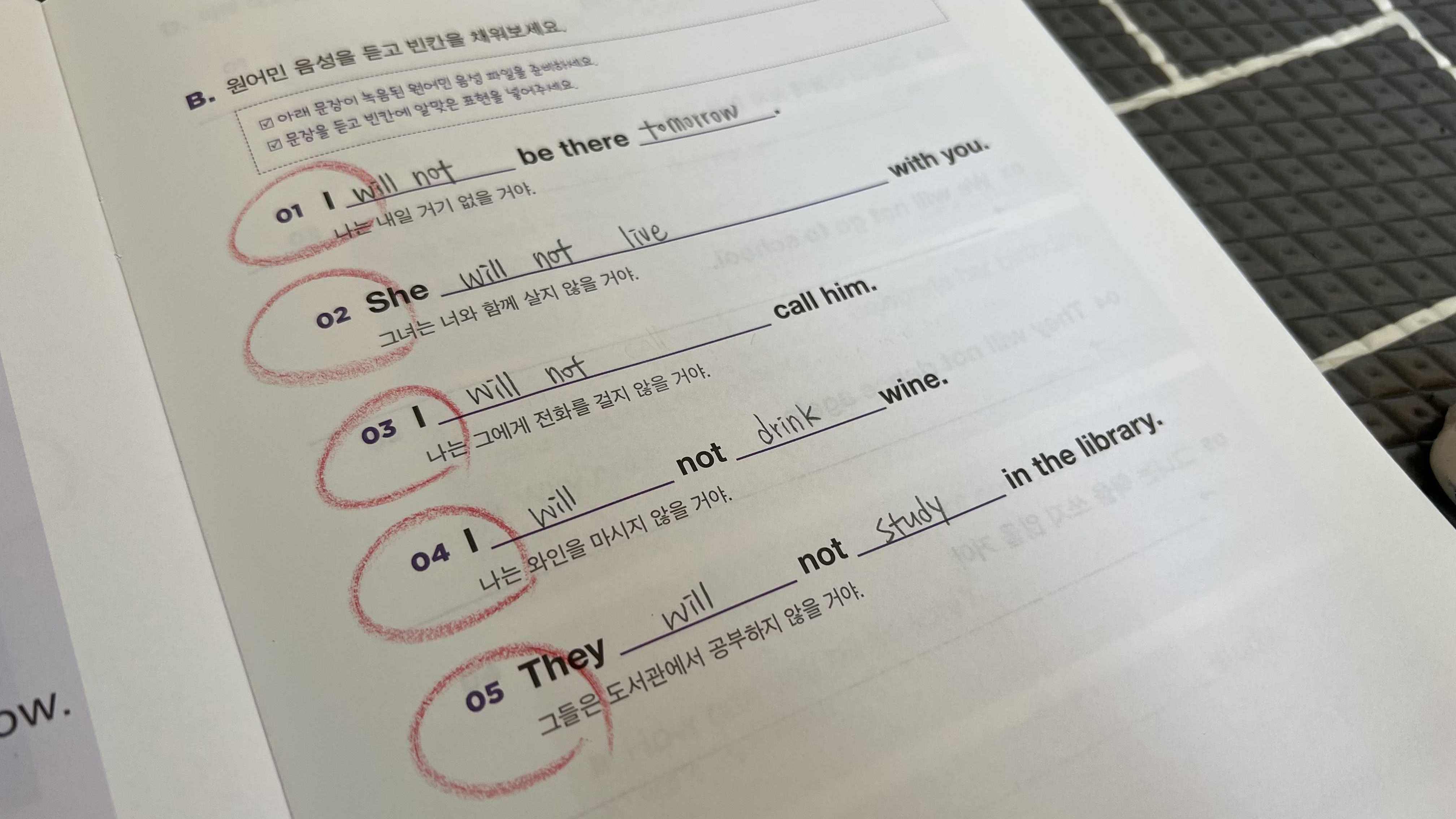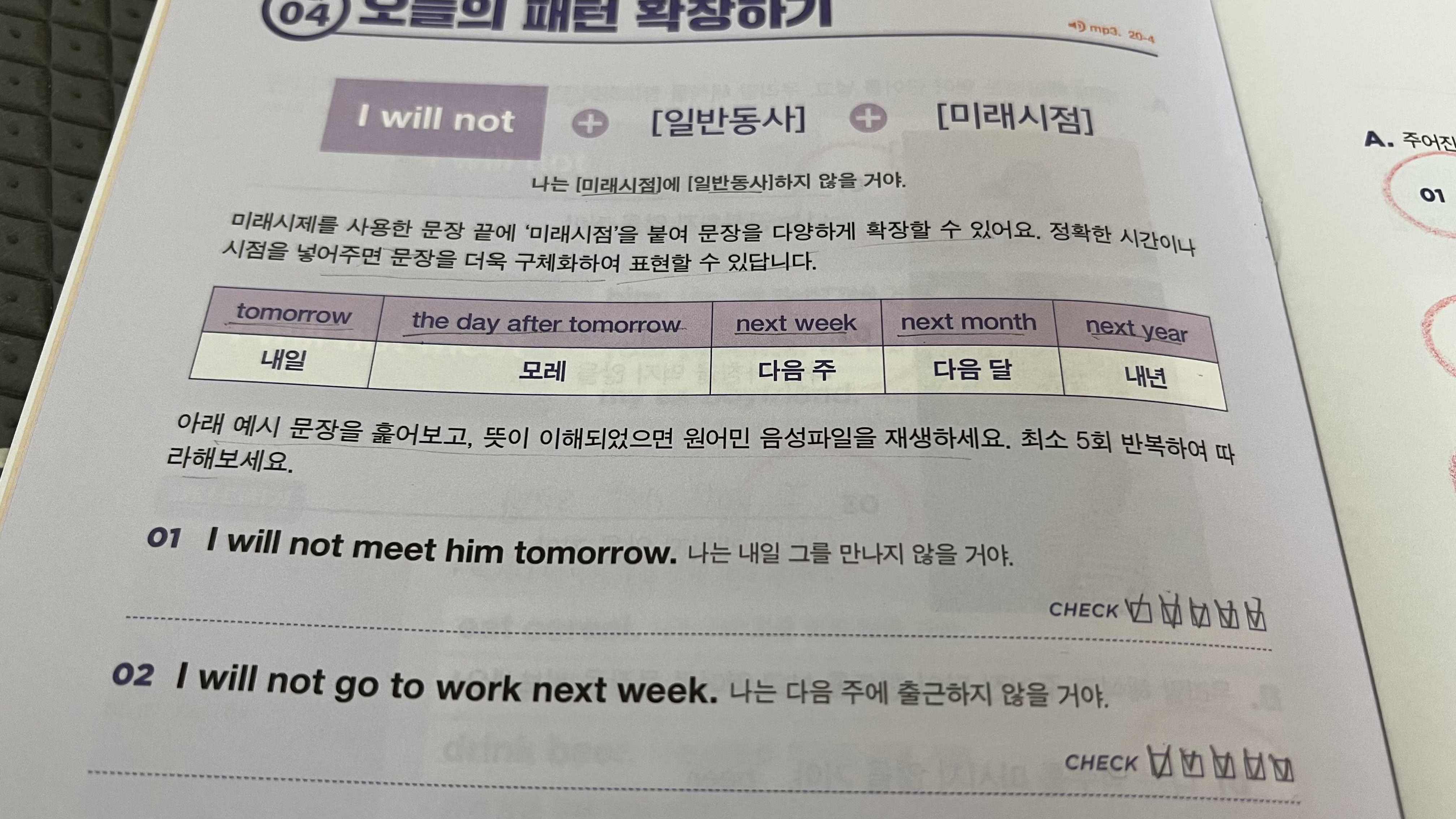 미래시제 부정문은 미래에 하지 않을 행동, 다짐 등을 말할 때에 유용하게 사용할 수 있는 표현인 것 같다. will과 동사원형 사이에 not만 넣으면 되기 때문에 이번 주에는 공부하는 것이 수월한 편이었다.