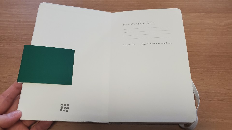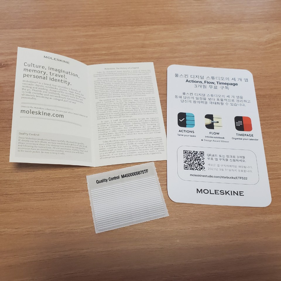 다이어리의 가장 뒷면에는 영수증이나 각종 메모를 보관할 수 있는 작은 종이포켓이 달려 있고, 몰스킨 무료구독권과 상품설명서, 2021년 스타벅스 쿠폰 3장이 들어있다.