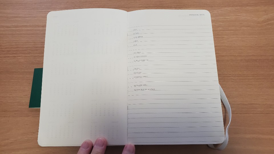 몰스킨 브랜드 다이어리로 뒷면에 MOLESKINE 알파벳이 각인되어 있다. 표면이 매끈한 재질이라서 스탠딩 다이어리보다 오염에는 강할 것으로 판단된다.