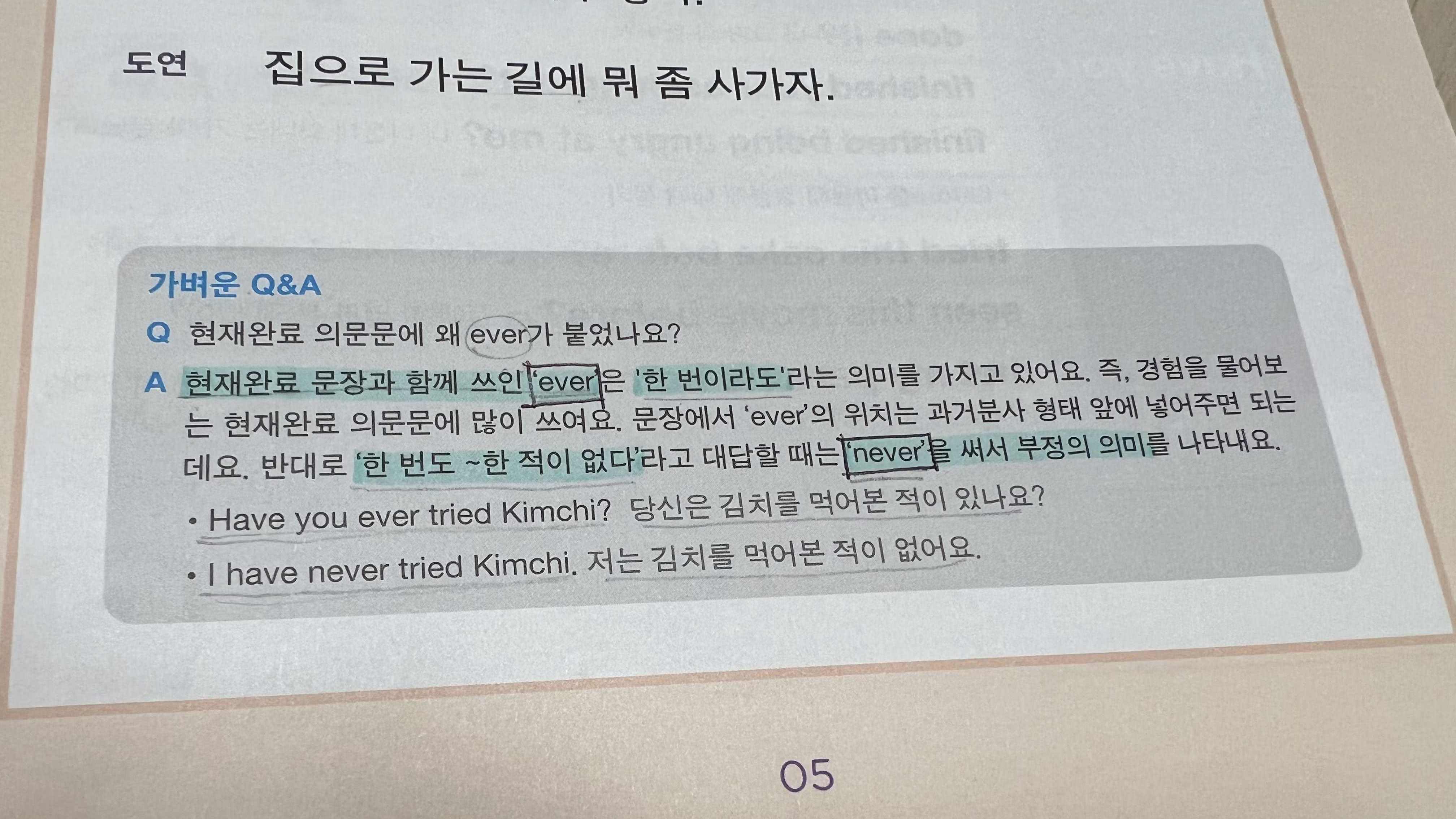 예전부터 늘 궁금했던 ever가 무슨 의미였는지 나이를 서른여섯이나 먹고 드디어 알게 되었다. 현재완료 의문문에 ever가 붙으면 '한 번이라도' 라는 의미를 갖는다고 한다. 예를 들어서 Have you ever tried Kimchi? 라고 물으면 너는 한 번이라도 김치를 먹어본 적이 있어? 라고 묻는 것이다.