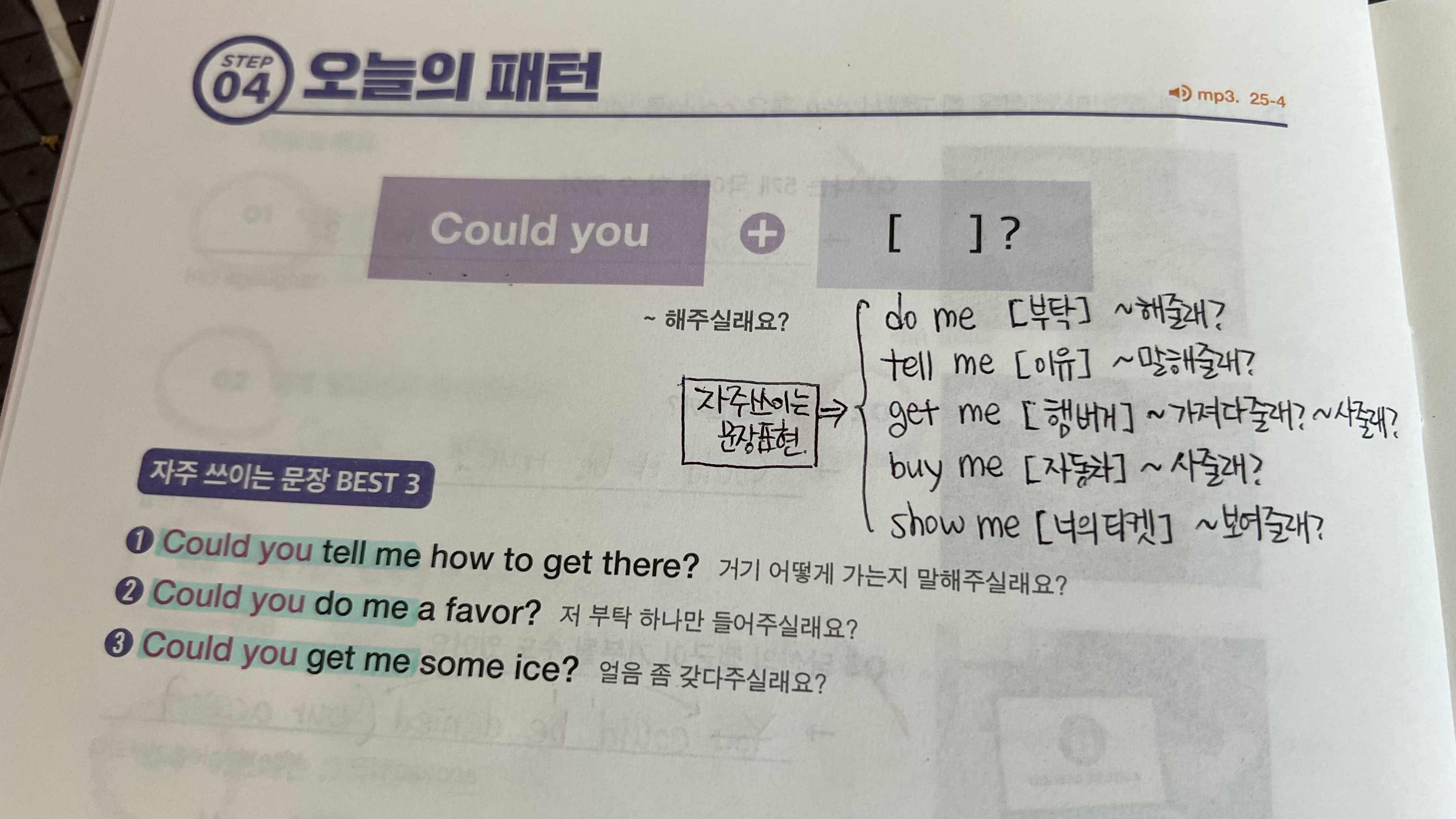 오늘의 패턴에서는 Could you~? 로 시작하는 문장을 배웠다. 자주 쓰이는 문장표현도 함께 알려주니 영어회화에도 도움이 된다. 그리고 오늘의 패턴 확장하기에서는 Could you 뒤에 make가 붙은 문장을 배웠다. 상대방이 아닌 누군가 혹은 어떤 것이 해당 행동을 하게끔 만들어달라는 부탁 표현이다.