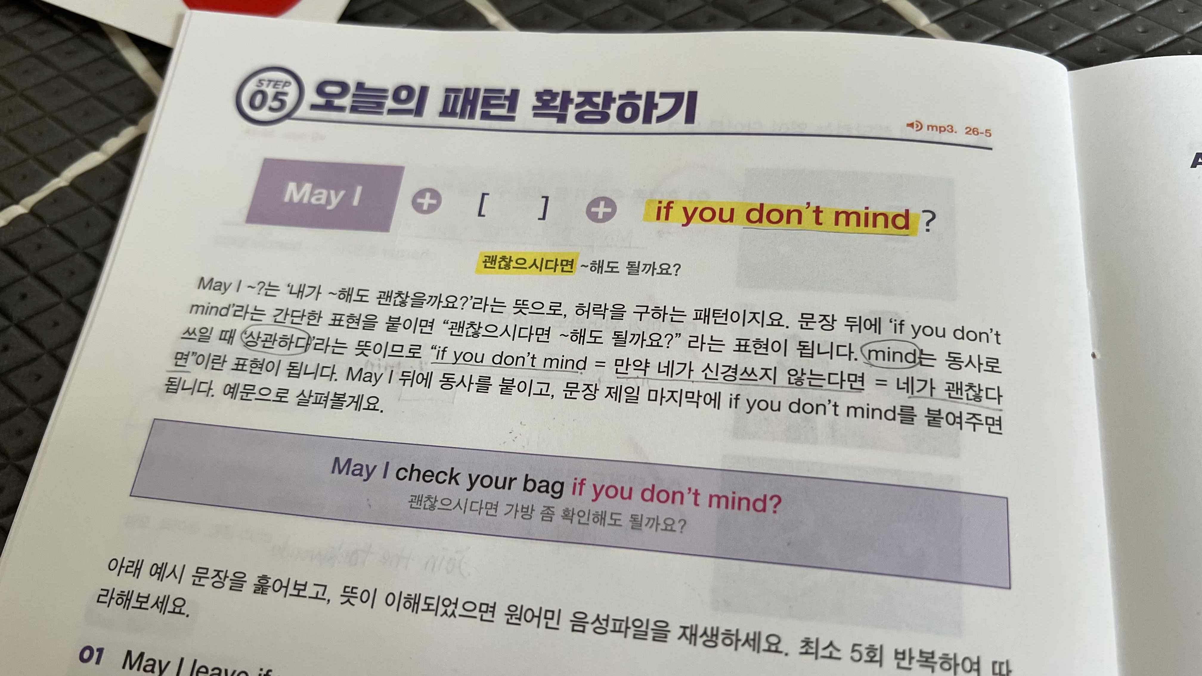 또 이번 주차에서는 May I ~? 로 시작하는 허락, 요청의 의문문 패턴도 배웠다. 문장 뒤에 if you don't mind를 붙이면 '괜찮으시다면' 이라는 의미로 해석된다고 한다. 이건 그냥 통째로 외우는 것이 좋을 것 같아서 익숙해지도록 문제를 푸는 내내 반복해서 읽어보았다.