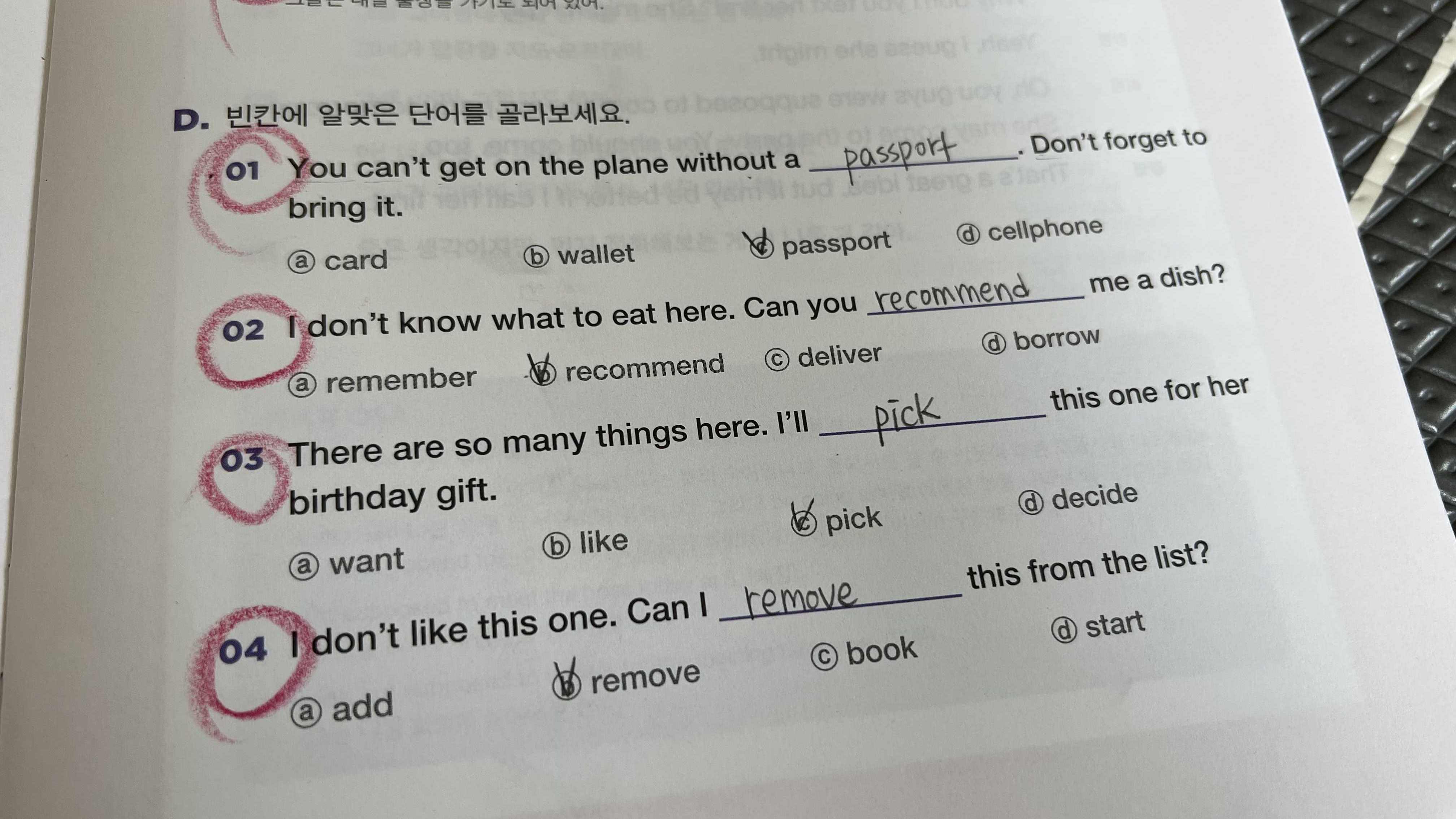 레벨이 올라갈수록 혼자 공부를 하는 것이 어렵다. 그렇기 때문에 가벼운 학습지에서 제공하는 온라인 강의가 더욱 소중해진다. 아마 이 강의의 중요성은 앞으로 점점 더 커질 것 같다. 레벨3 교재부터는 단어 문제가 추가되어 잘 외웠는지 한 번 더 체크할 수 있다. a, b, c, d 중에 하나를 선택하는 문제를 보니 대학생 때 토익 공부하던 생각이 났다.