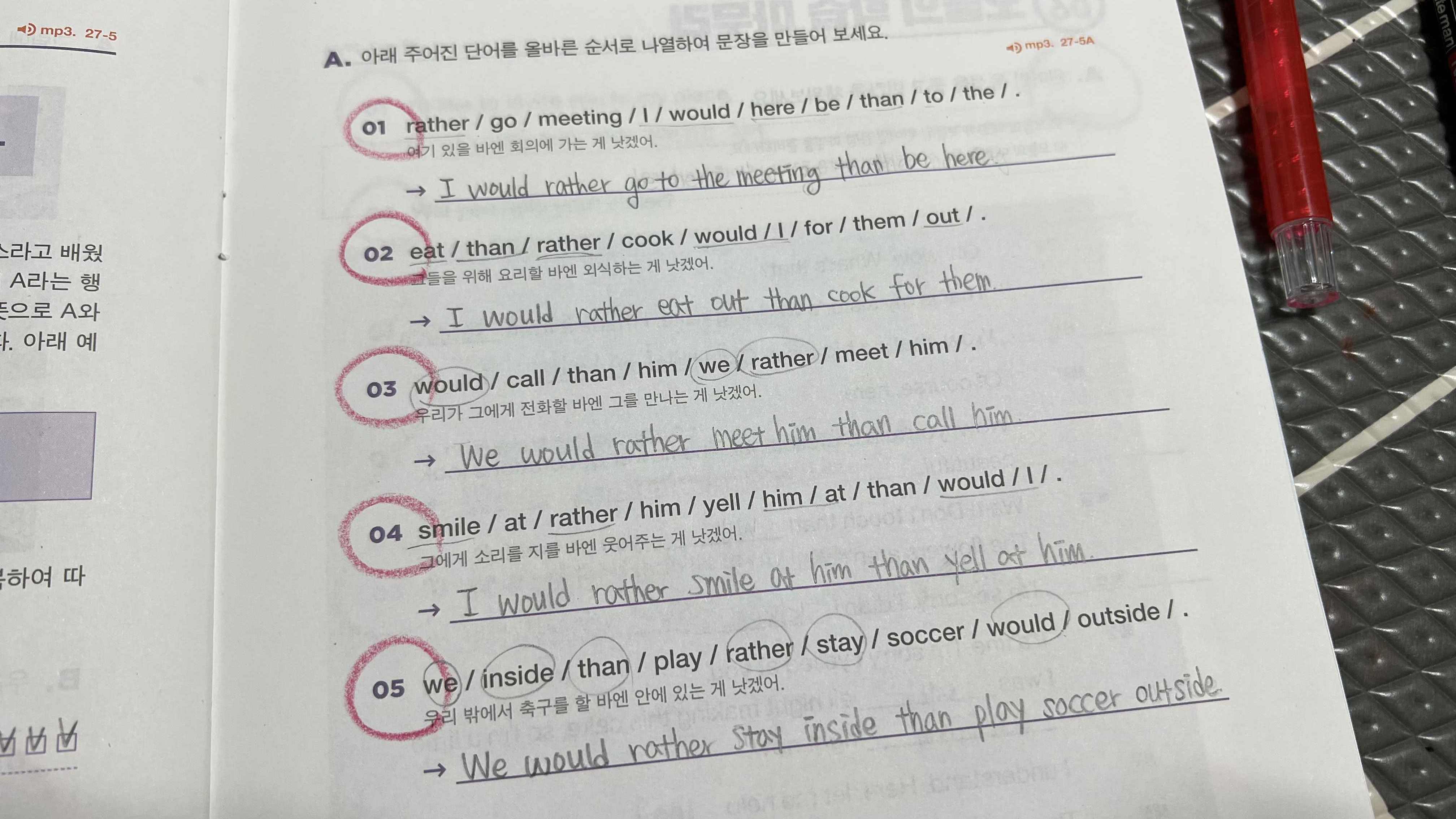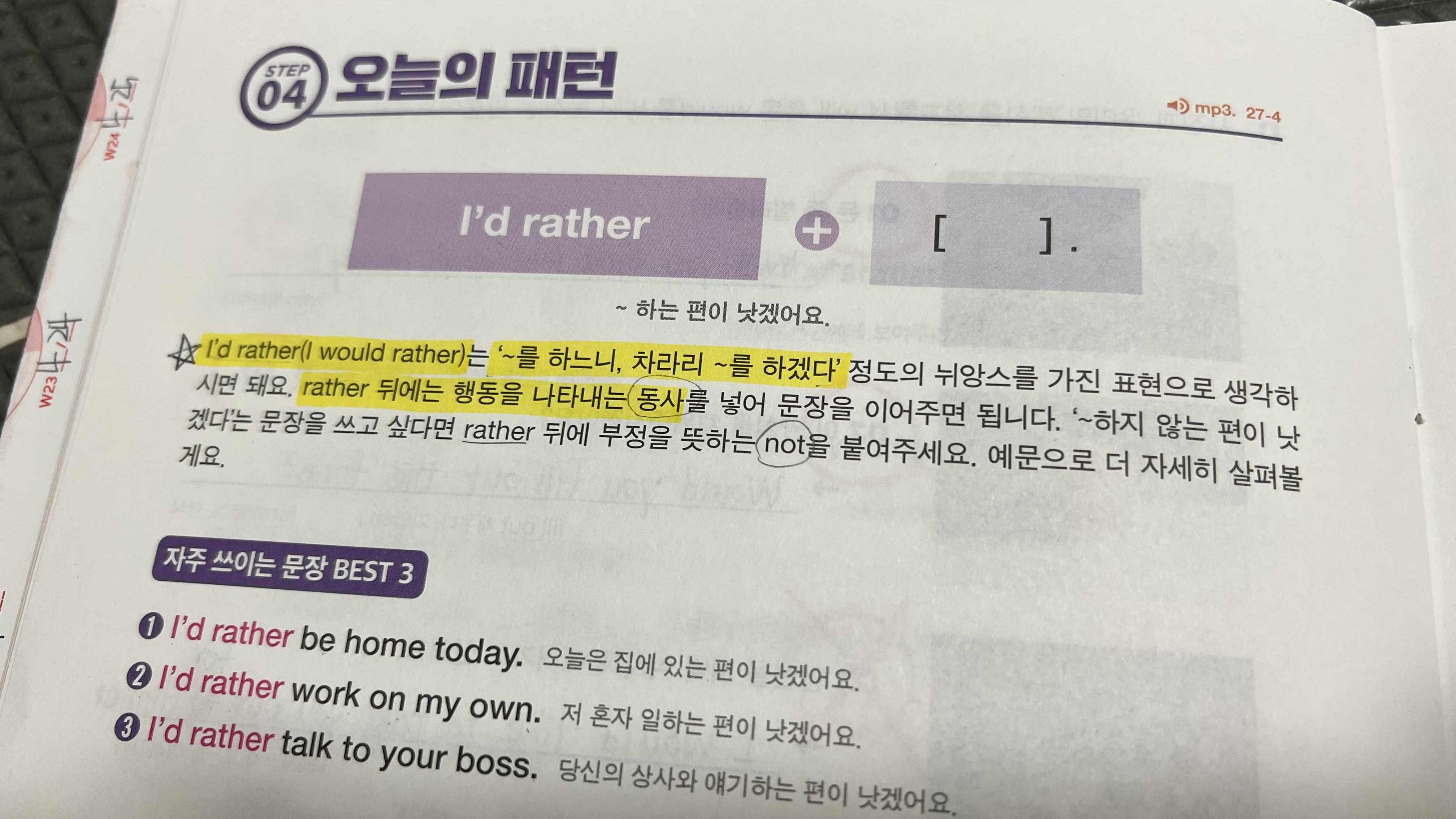 오늘의 패턴과 패턴 확장하기에서는 예전에 학교에서 배운 기억이 있는 I'd rather~ 표현에 대해서 공부했다.