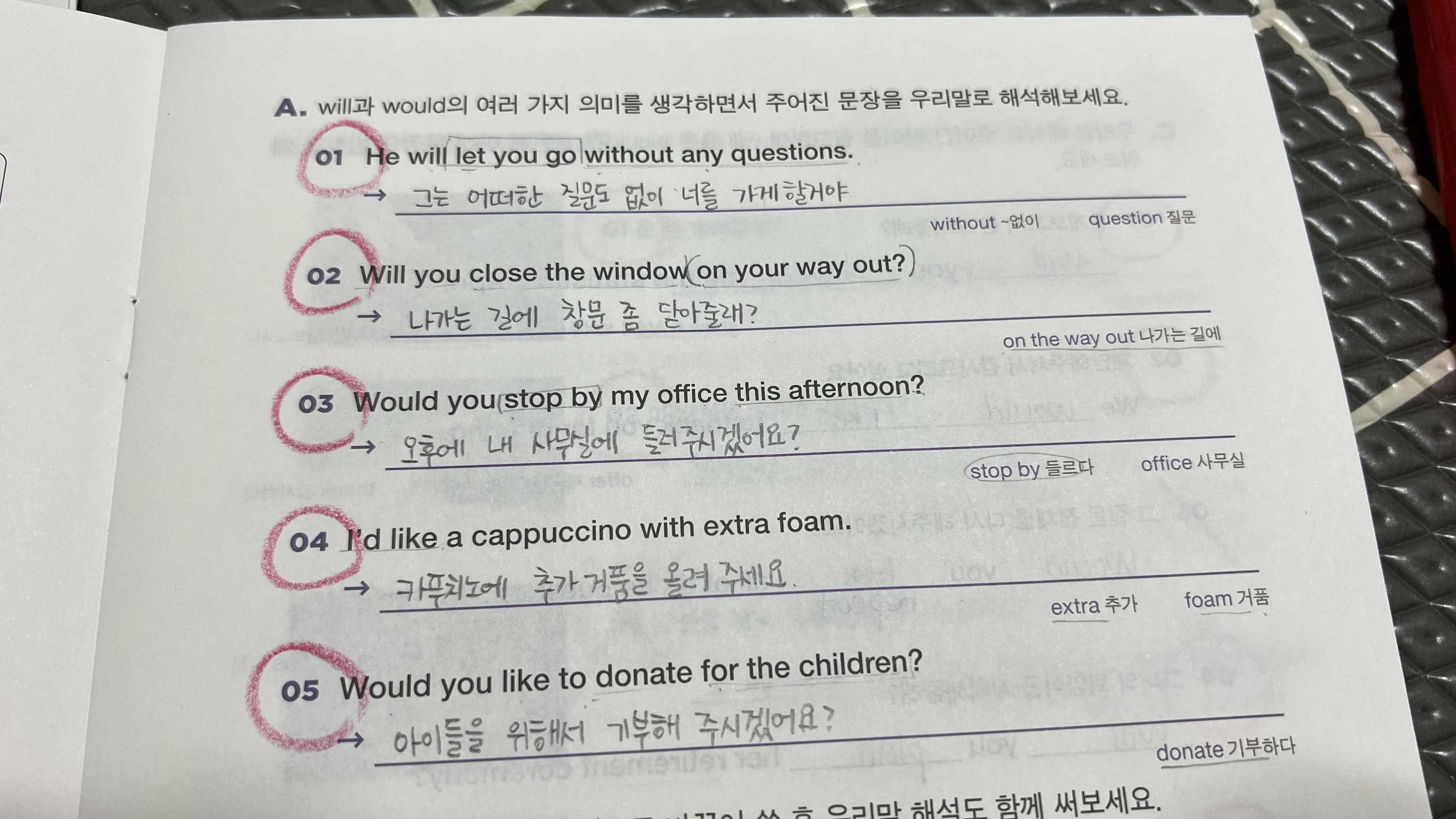 가벼운 영어 학습지 27주차에서는 will과 would의 개념과 다양한 사용 패턴에 대해서 공부했다. 예전에는 내가 공부를 시작하면 첫째 하요미가 옆에 와서 관심을 보이고 자기도 영어숙제를 하곤 했는데, 이제는 더 이상 그러지 않는다. (왜 때문에...?) 하요미 영어학원 숙제는 매일 있는데 자꾸 나중에 하려고 미루니 걱정이다. 다시 나란히 앉아서 영어공부를 할 수 있는 방법은 없으려나?