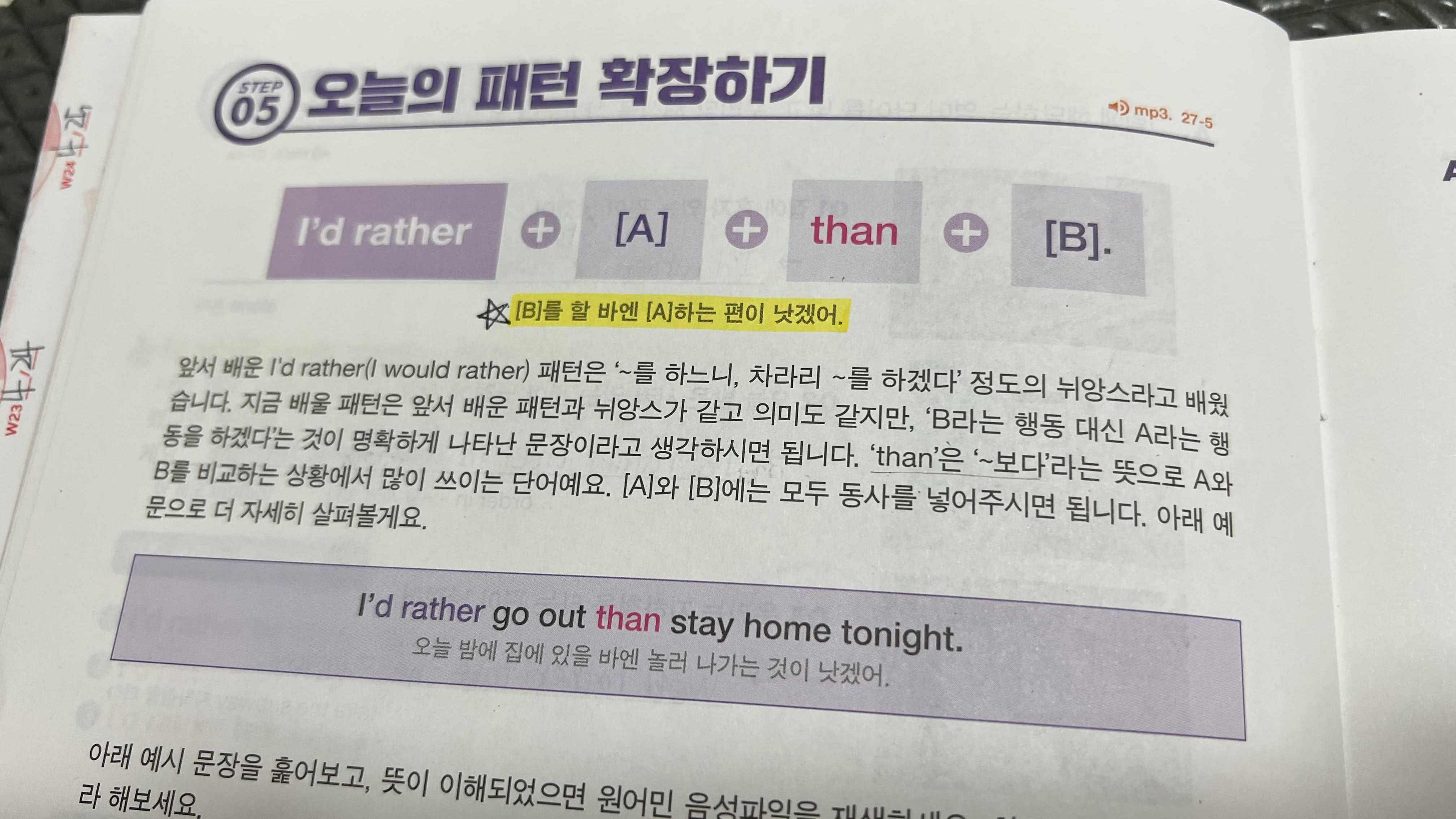 오늘의 패턴과 패턴 확장하기에서는 예전에 학교에서 배운 기억이 있는 I'd rather~ 표현에 대해서 공부했다.