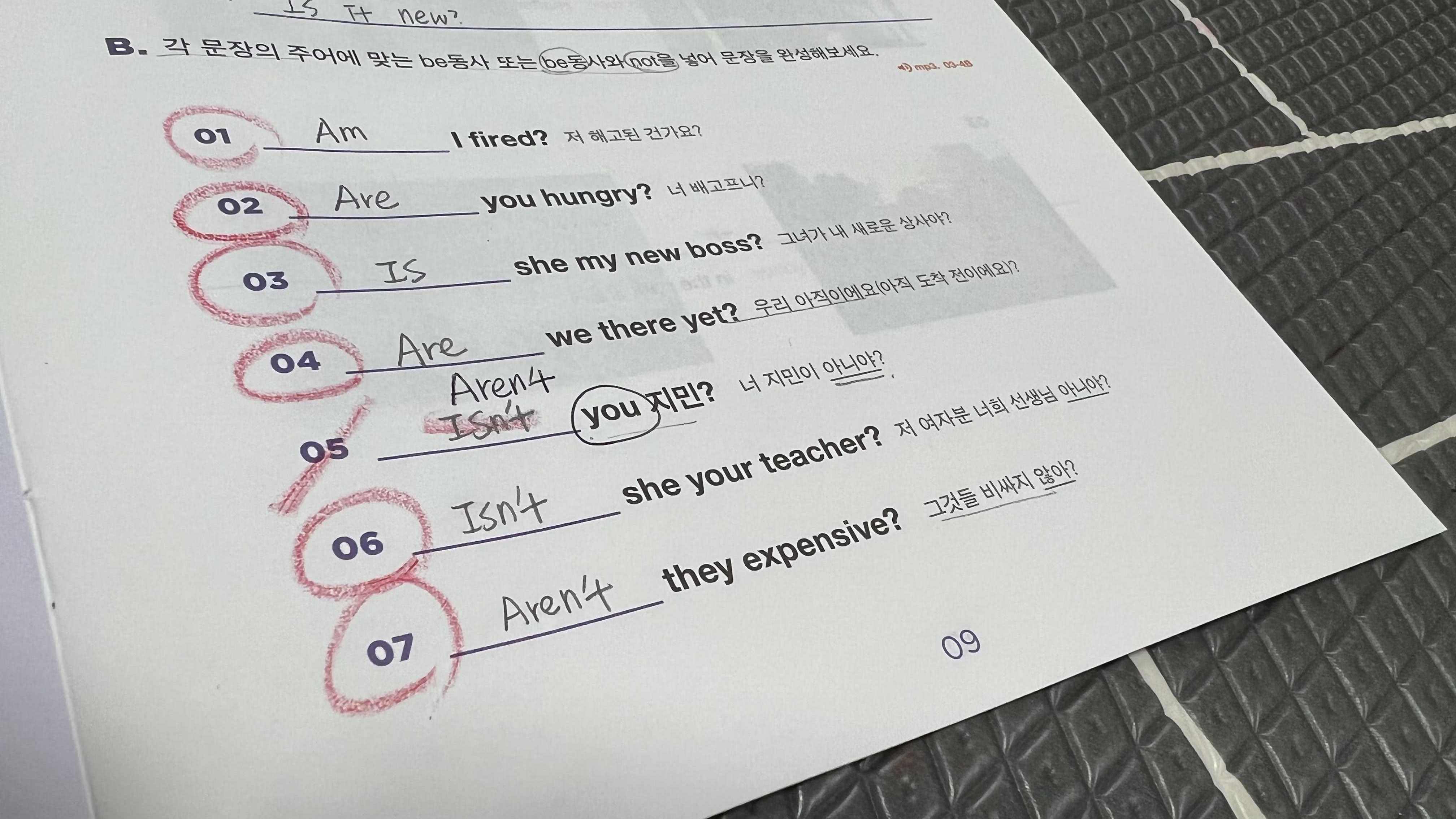 1주차에는 be 동사, 2주차에는 be동사 부정문, 이번 3주차에는 be동사 의문문의 개념을 익히는 게 학습 목표이다. 엇? 그렇다면 다음에는 일반동사, 일반동사 부정문, 일반동사 의문문의 순서일 것 같은데? 얼른 3주차를 끝내고 4주차 학습지를 열어서 예상이 맞는지 확인해 보고 싶어졌다.