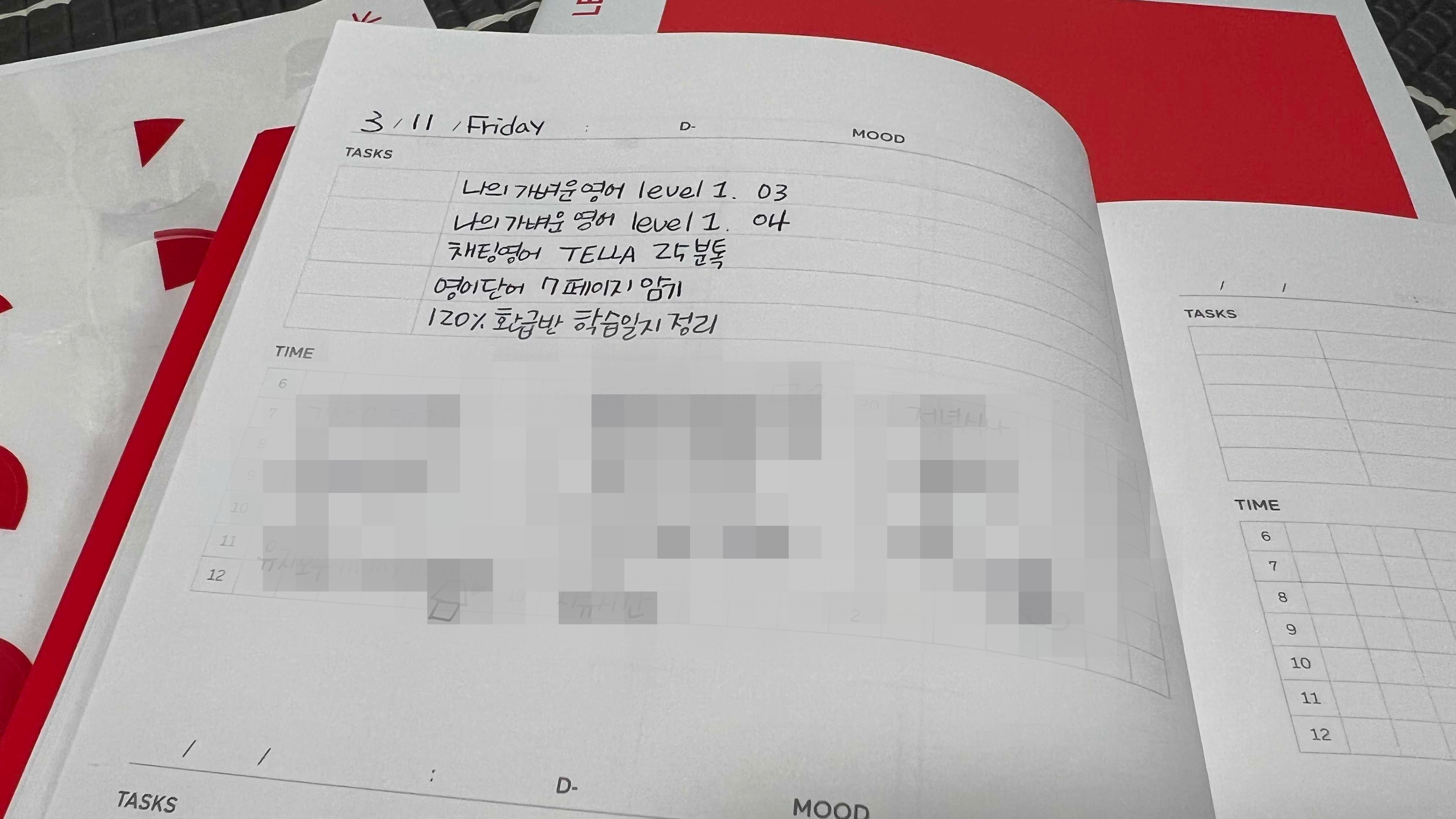 3주차 때에는 큰 맘 먹고 플래너를 꺼내 보았다. 고3 때에도 실패했던 학습 플래너인데, 서른 여섯살이 되어 다시 쓰고 있을 줄은 꿈에도 몰랐다 OTL 영어 학습지랑 단어 암기, 채팅영어 텔라 25분톡, 그리고 120% 페이백을 받기 위한 학습일지 정리까지... 이거 다 하려면 오늘은 왠지 하루종일 영어공부만 해야될 것 같다.