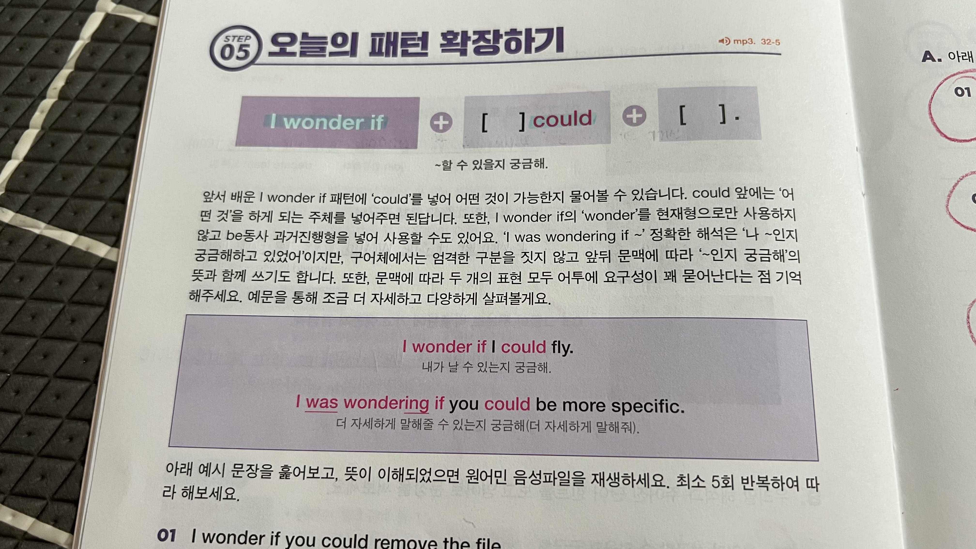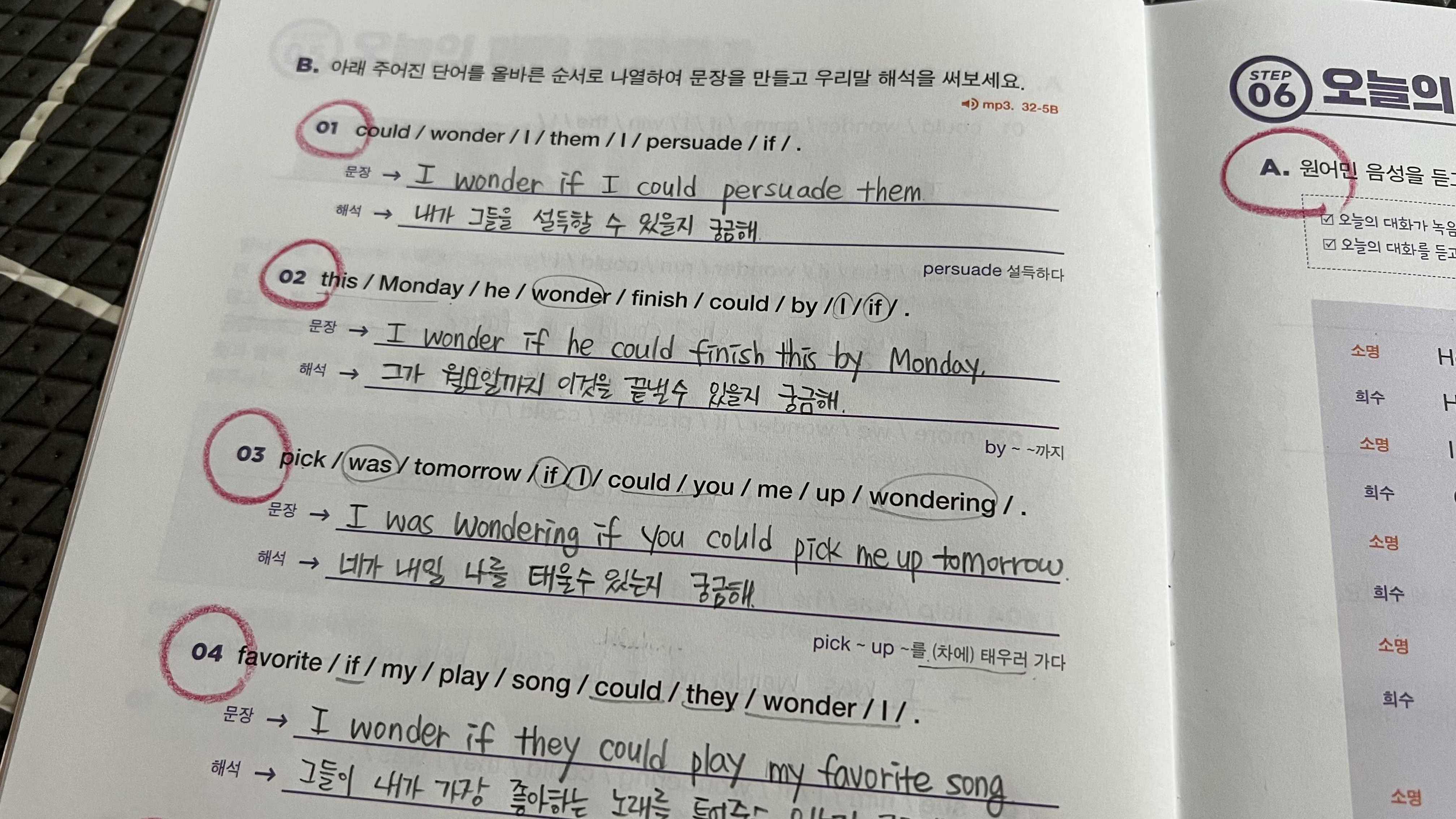 그리고 I wonder if 를 과거진행형으로 바꾸어서 I was wondering if ~ 라고도 말할 수 있다고 하는데 "궁금해하고 있었어." 라는 표현이 되어서 현재형과 거의 똑같은 의미로 사용되는 것 같다. 우리가 대화할 때도 같은 의미의 말을 여러가지 단어와 문장으로 표현할 수 있듯이 영어도 당연히 그럴텐데, 가벼운 학습지에서는 이렇게 다양한 문법들을 많이 소개해 주어 마음에 든다. 문제를 풀면서 패턴과 익숙해지고 마무리까지 확실하게~ 즐겁고 뿌듯한 시간이었다.
